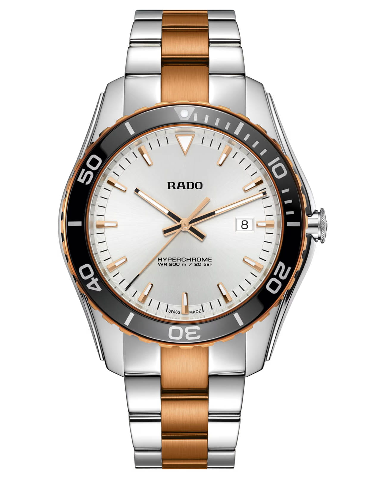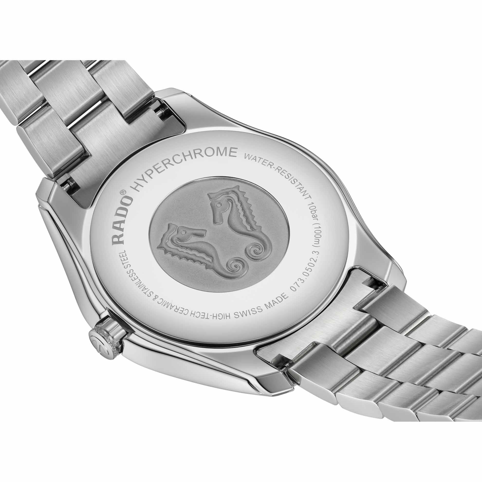 Мужские кварцевые часы Rado HyperChrome — это стильный и современный аксессуар с динамичным дизайном. Корпус диаметром 44 мм и толщиной 11,7 мм выполнен из нержавеющей стали. БезельБезельВнешний ободок, закрепляющий стекло. В спортивных часах так называется поворотное кольцо с делениями на циферблате, выполняет роль таймера – замеряет отрезки времени на шкале. Неподвижный безель – элемент декора. Однонаправленно вращающийся безель на дайверских часах позволяет фиксировать моменты погружения и выныривания на поверхность. — комбинированный, из нержавеющей стали с PVD-покрытиемPVDУльтратонкое покрытие наносится в технике вакуумного напыления, сочетает в себе нитрид титана особой прочности со слоем золота или оксида хрома. Несёт в себе декоративную или защитную функцию., с метками из Super-Luminova®. Циферблат синего цвета оформлен индексами и стрелками с люминесцентным покрытиемЛюминесцентное покрытиеПозволяет считывать показания времени в темноте. Производители наносят на стрелки, часовые индексы, безель или поверхность циферблата светонакопительный состав, дающий холодное свечение. Super-Luminova®, обеспечивающим хорошую читаемость в темноте. Циферблат защищён сапфировым стекломСапфировое стеклоПрочный и надёжный материал из кристалла сапфира синтетического происхождения, характеризующийся особой твёрдостью и устойчивостью к царапинам и повреждениям. с антибликовым покрытиемАнтибликовое покрытиеСлой оксида металла в 0,13-0,3 микрон, благодаря которому стекло часов не бликует и не отражает свет. Антибликовое покрытие уменьшает отражение света в 10 раз, обеспечивая отличную читаемость показателей циферблата.. Механизм — кварцевый калибр R073. Водонепроницаемость 200 wr, что позволяет плавать и нырять. Часы оснащены браслетом из нержавеющей стали с PVD-покрытиемPVDУльтратонкое покрытие наносится в технике вакуумного напыления, сочетает в себе нитрид титана особой прочности со слоем золота или оксида хрома. Несёт в себе декоративную или защитную функцию. и застёжкой «бабочка» с кнопкамиЗастёжка "бабочка"Такой вид застёжки дополняется предохранителями, помогающими избежать случайного раскрытия браслета. Обладают изящным исполнением. из титана и нержавеющей стали. Окошко даты расположено в положении 3 часов. Универсальный выбор для тех, кто ценит элегантность, надёжность и современный стиль.