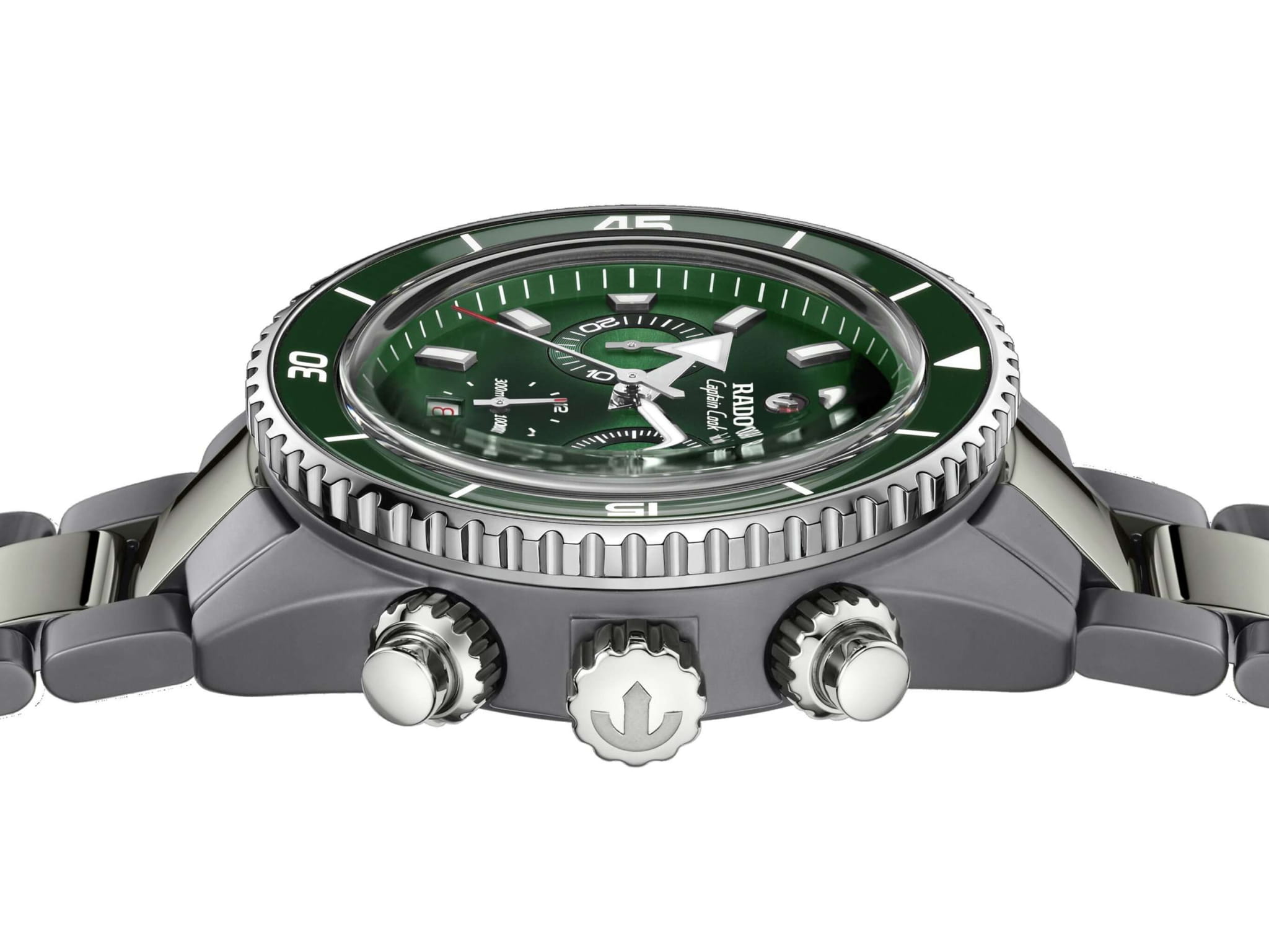 Мужские механические часы с автоподзаводом Rado Captain Cook — это вершина инженерной мысли и инноваций в материаловедении. Корпус диаметром 43 мм и толщиной 16,2 мм выполнен из цельного блока высокотехнологичной плазменной керамикиВысокотехнологичная плазменная керамикаИнновационный материал, технология запатентована. Выплавление керамики осуществляется в печи при 20 000 °C, белоснежный материал под воздействием ультравысокой температуры приобретает уникальный блеск, присущий металлам., созданной в экстремальных условиях — при температуре 20 000 °C, что изменило её молекулярную структуру и придало уникальное металлическое покрытие. БезельБезельВнешний ободок, закрепляющий стекло. В спортивных часах так называется поворотное кольцо с делениями на циферблате, выполняет роль таймера – замеряет отрезки времени на шкале. Неподвижный безель – элемент декора. Однонаправленно вращающийся безель на дайверских часах позволяет фиксировать моменты погружения и выныривания на поверхность. — вращающийся, стальной, с инкрустированным кольцом из зелёной керамики и метками с белым люминесцентным покрытиемЛюминесцентное покрытиеПозволяет считывать показания времени в темноте. Производители наносят на стрелки, часовые индексы, безель или поверхность циферблата светонакопительный состав, дающий холодное свечение. Super-Luminova®. Циферблат зелёного цвета оформлен тремя субциферблатами: 12-часовой, 30-минутный и малые секунды. Окошко даты расположено в положении 6 часов. Циферблат защищён сапфировым стекломСапфировое стеклоПрочный и надёжный материал из кристалла сапфира синтетического происхождения, характеризующийся особой твёрдостью и устойчивостью к царапинам и повреждениям. с антибликовым покрытиемАнтибликовое покрытиеСлой оксида металла в 0,13-0,3 микрон, благодаря которому стекло часов не бликует и не отражает свет. Антибликовое покрытие уменьшает отражение света в 10 раз, обеспечивая отличную читаемость показателей циферблата. с обеих сторон, устойчивым к царапинам. Механизм — автоматический хронограф с антимагнитной пружиной Nivachron™Nivachron™Специально разработанный инновационный сплав Nivachron™ повышает устойчивость часов к воздействию магнитных полей., отрегулированный в пяти положениях. В центре циферблата — подвижной якорь на рубиновой пластине. Часы оснащены браслетом из матовой и полированной высокотехнологичной плазменной керамикиВысокотехнологичная плазменная керамикаИнновационный материал, технология запатентована. Выплавление керамики осуществляется в печи при 20 000 °C, белоснежный материал под воздействием ультравысокой температуры приобретает уникальный блеск, присущий металлам. с трёхсекционной застёжкой из титана. Водонепроницаемость 300 м позволяет использовать часы для профессионального плавания и дайвинга. Идеальный выбор для тех, кто ценит передовые технологии, точность и смелый дизайн.