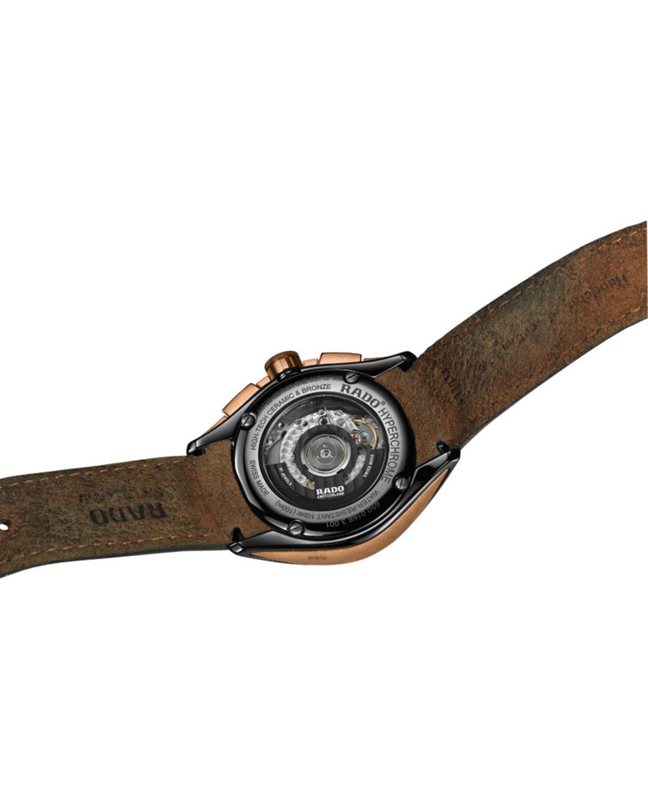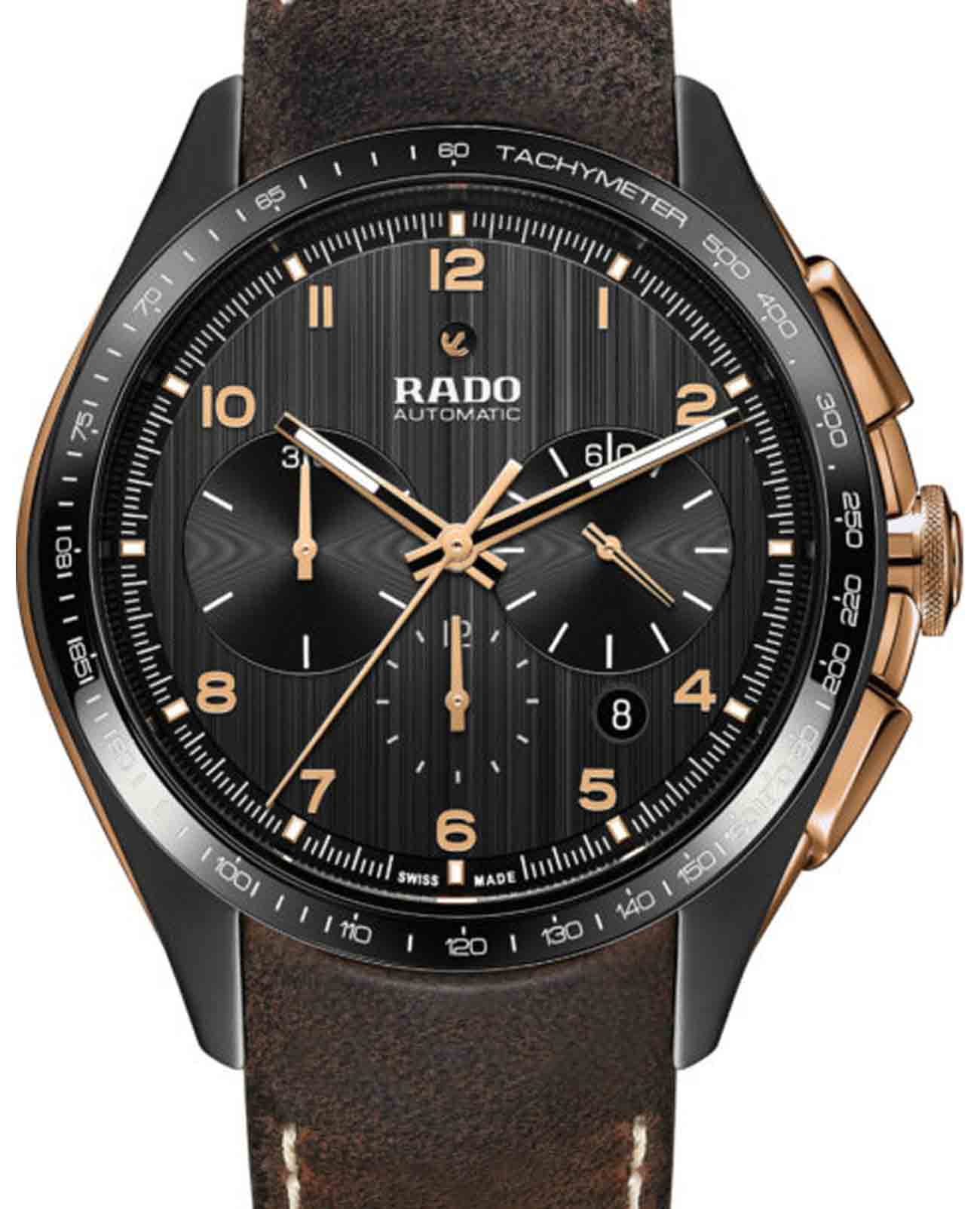 Мужские швейцарские часы-хронографХронографФункция позволяет измерять отрезки времени с особой точностью: часы, минуты, секунды. Верным признаком хронографа является наличие на циферблате 3 дополнительных окошек-счётчиков. Rado HyperChrome Automatic Chronograph R32503166. Корпус часов изготовлен из нержавеющей стали с PVD-покрытиемPVDУльтратонкое покрытие наносится в технике вакуумного напыления, сочетает в себе нитрид титана особой прочности со слоем золота или оксида хрома. Несёт в себе декоративную или защитную функцию. и высокотехнологичной керамикиВысокотехнологичная керамикаИнновационный запатентованный Rado материал с гладкой или матовой поверхностью. Керамика за счёт кристаллической структуры обладает повышенной устойчивостью от возникновения царапин. Материал способен принимать температуру тела человека, обеспечивая невероятный комфорт при ношении.. Сапфировое стеклоСапфировое стеклоПрочный и надёжный материал из кристалла сапфира синтетического происхождения, характеризующийся особой твёрдостью и устойчивостью к царапинам и повреждениям. устойчивое к мелким механическим повреждениям. БезельБезельВнешний ободок, закрепляющий стекло. В спортивных часах так называется поворотное кольцо с делениями на циферблате, выполняет роль таймера – замеряет отрезки времени на шкале. Неподвижный безель – элемент декора. Однонаправленно вращающийся безель на дайверских часах позволяет фиксировать моменты погружения и выныривания на поверхность. со шкалой тахиметраТахиметрРазмеченная шкала, располагается на ободке или безеле часов. Тахиметр позволяет рассчитать скорость на определённом участке пути, расстояние измеряется в километрах или милях.. Стрелки и метки с люминесцентным покрытиемЛюминесцентное покрытиеПозволяет считывать показания времени в темноте. Производители наносят на стрелки, часовые индексы, безель или поверхность циферблата светонакопительный состав, дающий холодное свечение.. Окошко даты находится в положении между 4 и 5 часов. Класс водозащиты: 100 метров, позволит плавать, нырять и заниматься другими водными видами спорта. Кожаный ремешок на раскладной застёжкеРаскладная застёжкаТакой тип застёжки используется только на браслетах из металла. Она никогда не раскрывается полностью, происходит разделение на 2 и более частей. Раскладывающая застёжка снизит вероятность потери часов к минимуму..