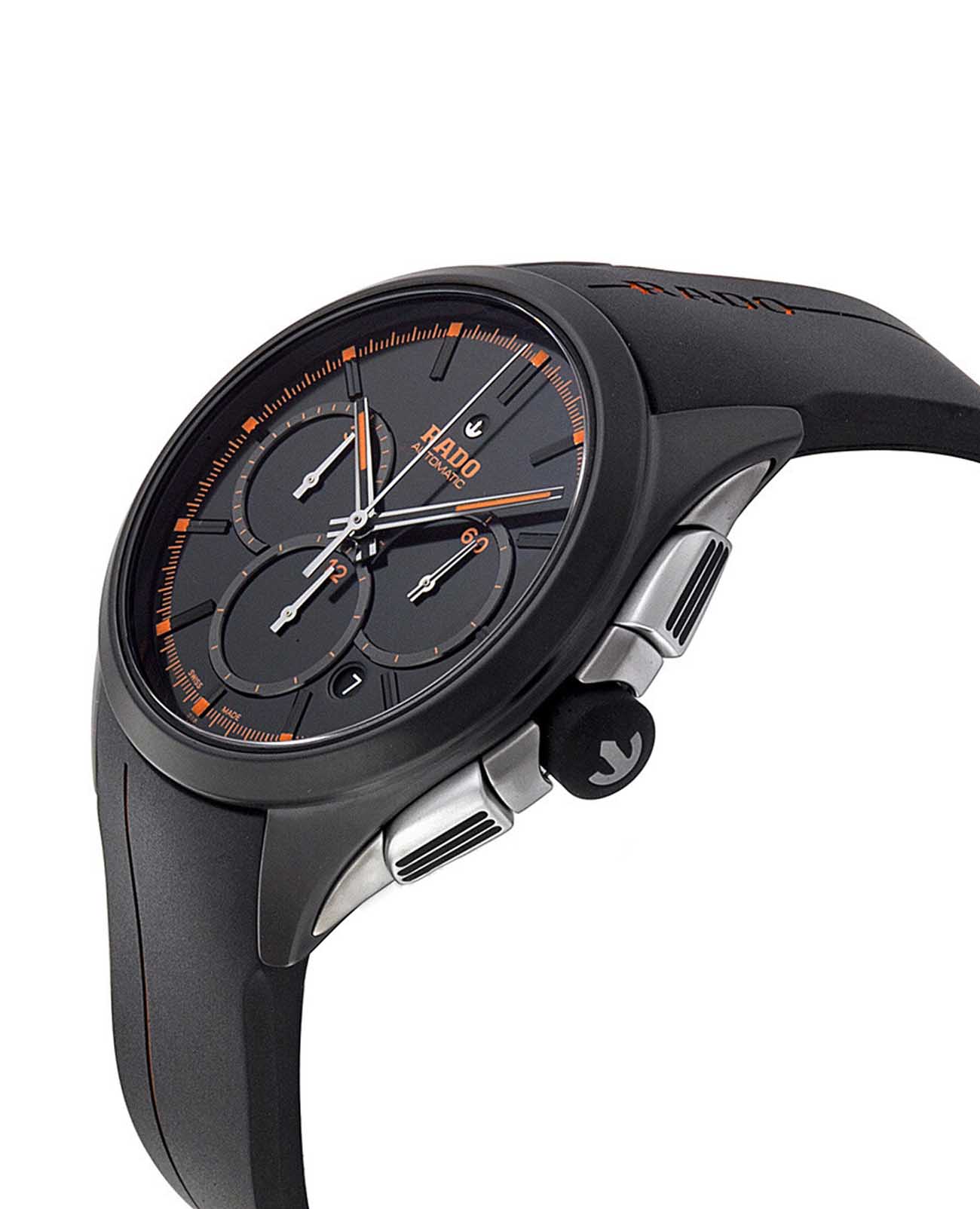 Мужские механические швейцарские часы- хронографХронографФункция позволяет измерять отрезки времени с особой точностью: часы, минуты, секунды. Верным признаком хронографа является наличие на циферблате 3 дополнительных окошек-счётчиков. с автоподзаводом Rado HyperChrome Automatic Chronograph R32525169. Сапфировое стеклоСапфировое стеклоПрочный и надёжный материал из кристалла сапфира синтетического происхождения, характеризующийся особой твёрдостью и устойчивостью к царапинам и повреждениям. устойчивое к мелким механическим повреждениям. Корпус часов изготовлен из высокотехнологичной керамикиВысокотехнологичная керамикаИнновационный запатентованный Rado материал с гладкой или матовой поверхностью. Керамика за счёт кристаллической структуры обладает повышенной устойчивостью от возникновения царапин. Материал способен принимать температуру тела человека, обеспечивая невероятный комфорт при ношении.. Окошко даты находится в положении между 4 и 5 часами. Стрелки с люминесцентным покрытиемЛюминесцентное покрытиеПозволяет считывать показания времени в темноте. Производители наносят на стрелки, часовые индексы, безель или поверхность циферблата светонакопительный состав, дающий холодное свечение.. Класс водозащиты: 100 метров, позволит плавать, нырять и заниматься другими водными видами спорта. Каучуковый ремешок на раскладной застёжкеРаскладная застёжкаТакой тип застёжки используется только на браслетах из металла. Она никогда не раскрывается полностью, происходит разделение на 2 и более частей. Раскладывающая застёжка снизит вероятность потери часов к минимуму..