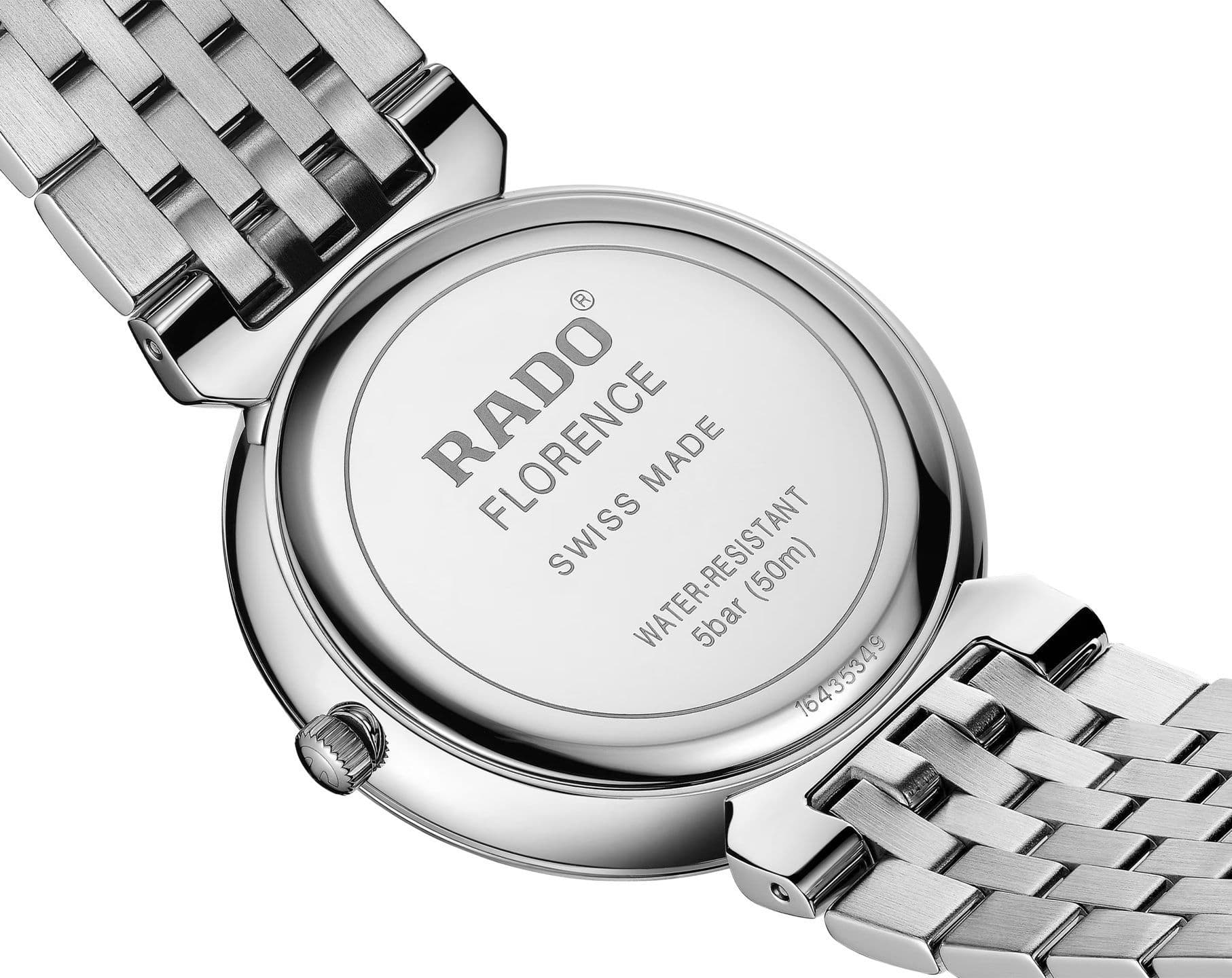 Швейцарские наручные часы с надёжным кварцевым механизмом Rado Florence Diamonds R48912163. Корпус и браслет часов изготовлены из нержавеющей стали. Сапфировое стеклоСапфировое стеклоПрочный и надёжный материал из кристалла сапфира синтетического происхождения, характеризующийся особой твёрдостью и устойчивостью к царапинам и повреждениям. с антибликовым покрытиемАнтибликовое покрытиеСлой оксида металла в 0,13-0,3 микрон, благодаря которому стекло часов не бликует и не отражает свет. Антибликовое покрытие уменьшает отражение света в 10 раз, обеспечивая отличную читаемость показателей циферблата., устойчивое к мелким механическим повреждениям. Стальной браслет на застёжке-бабочке с кнопкамиЗастёжка "бабочка"Такой вид застёжки дополняется предохранителями, помогающими избежать случайного раскрытия браслета. Обладают изящным исполнением. . Класс водозащиты: 50 метров, позволит защитить корпус от случайных брызг или капель дождя. Окошко даты находится в положении 6 часов. Циферблат инкрустирован бриллиантами.