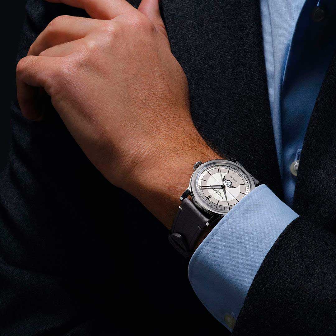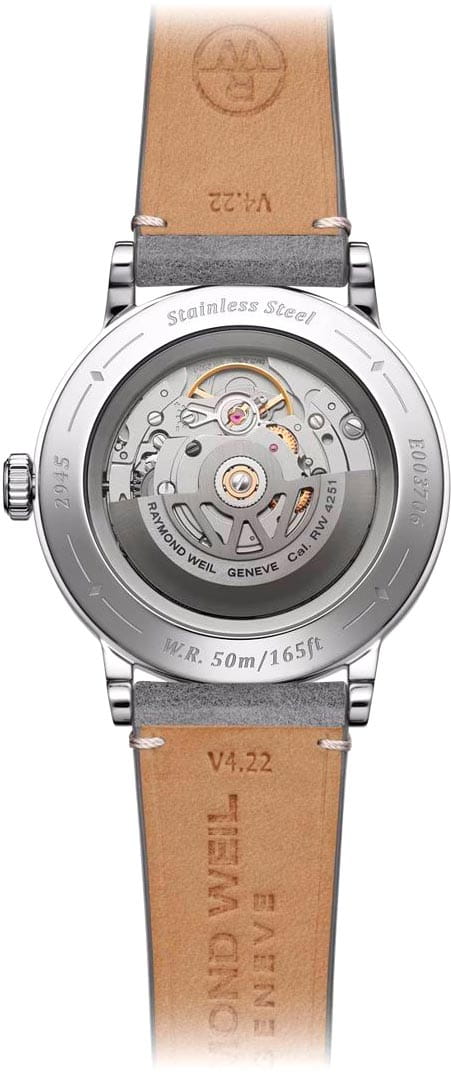 Raymond Weil 2945-STC-65001—мужские швейцарские часы с автоподзаводом Millesime Automatic Moon Phase. Модель оснащена автоматическим механизмом RW4280 с функцией фазы луны и запасом хода 41 час, заключенным в стальной корпус диаметром 39,5 мм с сапфировым стекломСапфировое стеклоПрочный и надёжный материал из кристалла сапфира синтетического происхождения, характеризующийся особой твёрдостью и устойчивостью к царапинам и повреждениям., устойчивым к царапинам и бликам. Матовый циферблат разделен на секторы.  Метки и стрелки с люминесцентным покрытиемЛюминесцентное покрытиеПозволяет считывать показания времени в темноте. Производители наносят на стрелки, часовые индексы, безель или поверхность циферблата светонакопительный состав, дающий холодное свечение., которое светится в темноте после непродолжительной зарядки на свету. Серый ремешок из натуральной кожи дополнен с классической застежкой, обеспечивая комфорт и элегантность. Часы обладают водонепроницаемостью до 50 метров, подходят для повседневного использования.