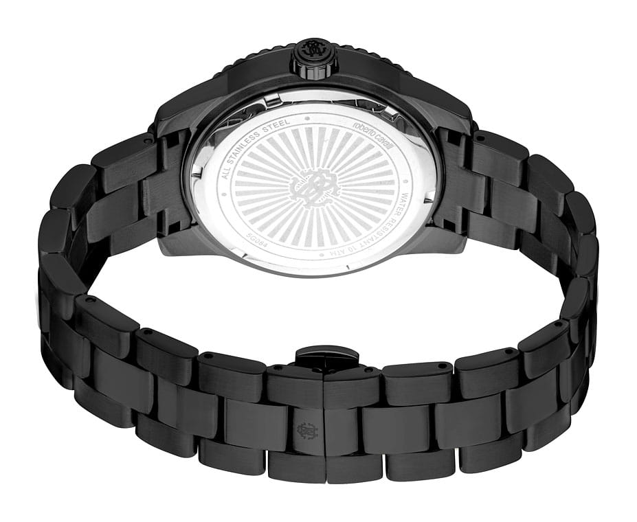 ROBERTO CAVALLI Acquatico RC5G084M0035 — стильные итальянские часы сочетающие в себе элегантность и современный функционал. Круглый корпус диаметром 42 мм выполнен из нержавеющей стали с PVD-покрытиемPVDУльтратонкое покрытие наносится в технике вакуумного напыления, сочетает в себе нитрид титана особой прочности со слоем золота или оксида хрома. Несёт в себе декоративную или защитную функцию., толщина корпуса составляет 11 мм, что придает модели выразительный внешний вид и надежную защиту от внешних воздействий. Часы оснащены кварцевым механизмом, также обладают функцией отображения даты, что делает их удобными для ежедневного использования. Минеральное стеклоМинеральное стеклоМинеральное стекло представляет собой искусственно выращенный минерал кварца. Такое стекло отличается особой устойчивостью к повреждениям и царапинам. Уступает по некоторым качествам сапфировому стеклу. защищает часы от царапин. Водозащита 100 метров, позволит плавать, нырять и заниматься другими водными видами спорта. Стальной браслет на застёжке-бабочке с кнопкамиЗастёжка "бабочка"Такой вид застёжки дополняется предохранителями, помогающими избежать случайного раскрытия браслета. Обладают изящным исполнением. обеспечивает комфортное ношение. Поворотный безельБезельВнешний ободок, закрепляющий стекло. В спортивных часах так называется поворотное кольцо с делениями на циферблате, выполняет роль таймера – замеряет отрезки времени на шкале. Неподвижный безель – элемент декора. Однонаправленно вращающийся безель на дайверских часах позволяет фиксировать моменты погружения и выныривания на поверхность. с PVD-покрытиемPVDУльтратонкое покрытие наносится в технике вакуумного напыления, сочетает в себе нитрид титана особой прочности со слоем золота или оксида хрома. Несёт в себе декоративную или защитную функцию.. Стрелки и метки с люминесцентным покрытиемЛюминесцентное покрытиеПозволяет считывать показания времени в темноте. Производители наносят на стрелки, часовые индексы, безель или поверхность циферблата светонакопительный состав, дающий холодное свечение. обеспечивают отличную читаемость в любое время суток.
