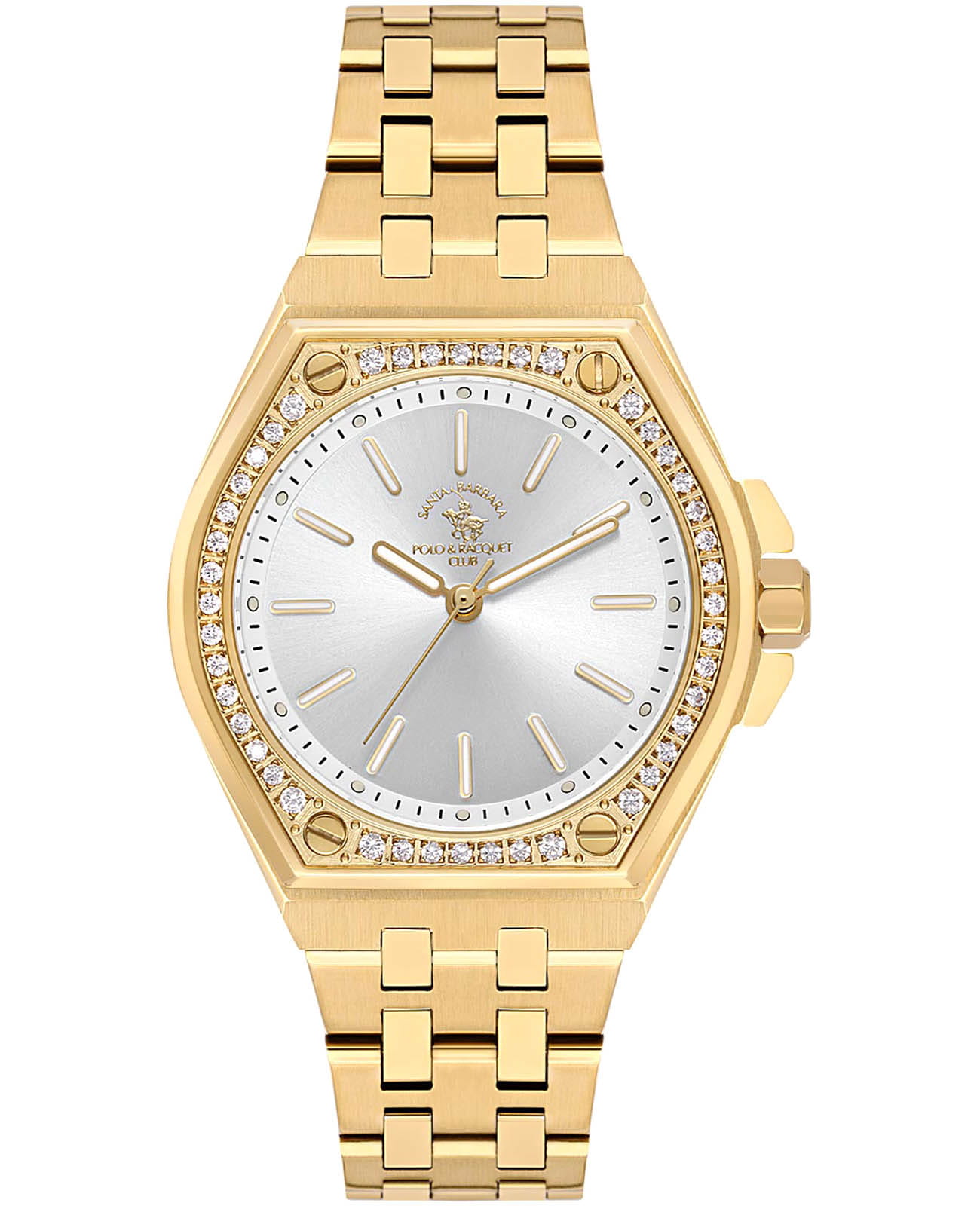 Женские кварцевые Santa Barbara Polo & Racquet Club SB.1.10589-2 — воплощение элегантности и технического совершенства. Изысканный корпус из нержавеющей стали с IP-покрытиемIP-покрытиеМетод ионного напыления. Демонстрирует повышенную устойчивость к истиранию, окислению и химическим веществам. Под воздействием высокого давления и температуры около 1500°C молекулы металла надёжно соединяются с частицами корпуса часов. золотистого цвета, диаметром 36 мм, что делает их устойчивыми к внешним воздействиям и придает благородный вид. Стрелки и метки с люминесцентным покрытиемЛюминесцентное покрытиеПозволяет считывать показания времени в темноте. Производители наносят на стрелки, часовые индексы, безель или поверхность циферблата светонакопительный состав, дающий холодное свечение., обеспечивающим хорошую читаемость в темноте. Изящный циферблат защищён минеральным стекломМинеральное стеклоМинеральное стекло представляет собой искусственно выращенный минерал кварца. Такое стекло отличается особой устойчивостью к повреждениям и царапинам. Уступает по некоторым качествам сапфировому стеклу., устойчивое к царапинам и механическим повреждениям. Браслет из стали с IP-покрытиемIP-покрытиеМетод ионного напыления. Демонстрирует повышенную устойчивость к истиранию, окислению и химическим веществам. Под воздействием высокого давления и температуры около 1500°C молекулы металла надёжно соединяются с частицами корпуса часов. на застёжке-бабочке с кнопкамиЗастёжка "бабочка"Такой вид застёжки дополняется предохранителями, помогающими избежать случайного раскрытия браслета. Обладают изящным исполнением. обеспечивает комфортное и безопасное ношение. Декоративный безельБезельВнешний ободок, закрепляющий стекло. В спортивных часах так называется поворотное кольцо с делениями на циферблате, выполняет роль таймера – замеряет отрезки времени на шкале. Неподвижный безель – элемент декора. Однонаправленно вращающийся безель на дайверских часах позволяет фиксировать моменты погружения и выныривания на поверхность. украшен кристаллами. Водонепроницаемость 50 метров позволит защитить корпус от случайных брызг или капель дождя. Идеальный выбор для тех, кто ценит элегантный дизайн и качество.