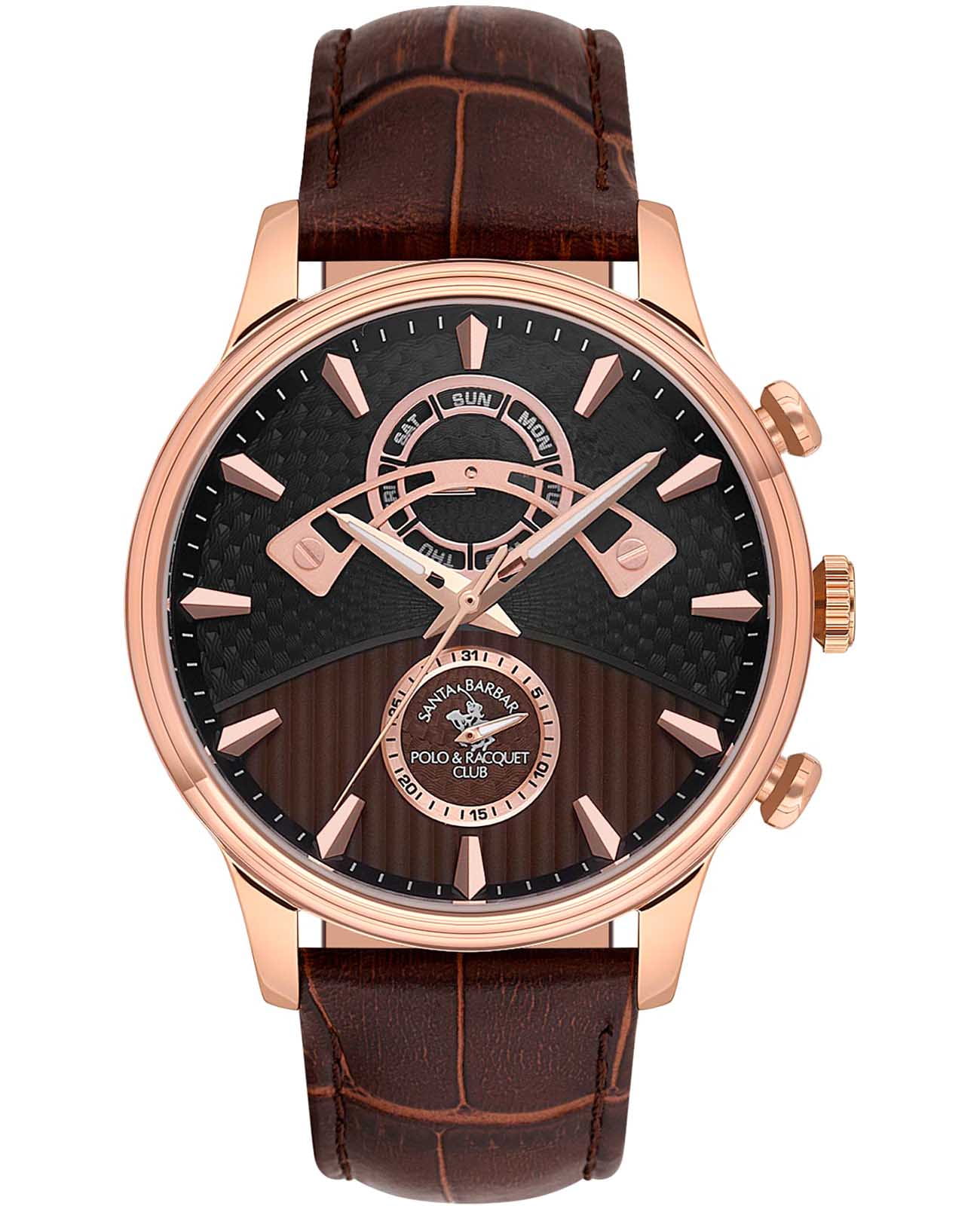 Мужские кварцевые часы Santa Barbara Polo & Racquet Club SB.1.10593-4 — воплощение элегантности и технического совершенства. Корпус из нержавеющей стали с IP-покрытиемIP-покрытиеМетод ионного напыления. Демонстрирует повышенную устойчивость к истиранию, окислению и химическим веществам. Под воздействием высокого давления и температуры около 1500°C молекулы металла надёжно соединяются с частицами корпуса часов. цвета розового золота, диаметром 45 мм, что делает их устойчивыми к внешним воздействиям и придает благородный вид. Стрелки с люминесцентным покрытиемЛюминесцентное покрытиеПозволяет считывать показания времени в темноте. Производители наносят на стрелки, часовые индексы, безель или поверхность циферблата светонакопительный состав, дающий холодное свечение., обеспечивающим хорошую читаемость в темноте. Циферблат защищён минеральным стекломМинеральное стеклоМинеральное стекло представляет собой искусственно выращенный минерал кварца. Такое стекло отличается особой устойчивостью к повреждениям и царапинам. Уступает по некоторым качествам сапфировому стеклу. устойчивое к царапинам и механическим повреждениям. Циферблат разделен на две фактурные части и украшен фирменным логотипом. Дата и день недели вынесены на отдельные циферблаты. Кожаный ремешок на застёжке-бабочке с кнопкамиЗастёжка "бабочка"Такой вид застёжки дополняется предохранителями, помогающими избежать случайного раскрытия браслета. Обладают изящным исполнением. обеспечивает комфортное и безопасное ношение. Водонепроницаемость 50 метров позволит защитить корпус от случайных брызг или капель дождя. Идеальный выбор для тех, кто ценит элегантный дизайн и качество.