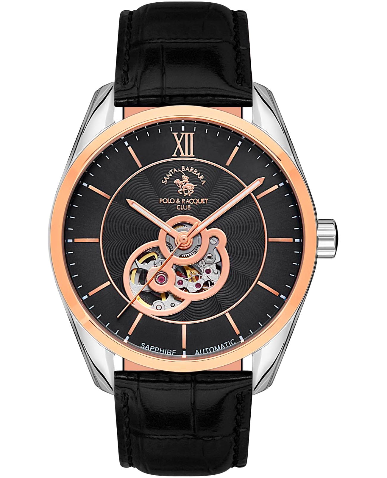 Мужские механические часы с автоподзаводом Santa Barbara Polo & Racquet Club SB.4.1008-7 — это стильный и функциональный аксессуар для современного джентльмена. Круглый стальной корпус c полированной отделкой диаметром 43 мм. Циферблат разделен на две части: одна гильошированная украшена фирменным логотипом, вторая с метками, выполнена по технологии Sunray (солнечные лучи). Накладные метки в виде штрихов и римской цифры. Стрелки с люминесцентным покрытиемЛюминесцентное покрытиеПозволяет считывать показания времени в темноте. Производители наносят на стрелки, часовые индексы, безель или поверхность циферблата светонакопительный состав, дающий холодное свечение., обеспечивающим хорошую читаемость в темноте. Циферблат защищён минеральным стекломМинеральное стеклоМинеральное стекло представляет собой искусственно выращенный минерал кварца. Такое стекло отличается особой устойчивостью к повреждениям и царапинам. Уступает по некоторым качествам сапфировому стеклу. с сапфировым покрытием. Часы оснащены кожаным ремешком с классической пряжкой. Неподвижный безельБезельВнешний ободок, закрепляющий стекло. В спортивных часах так называется поворотное кольцо с делениями на циферблате, выполняет роль таймера – замеряет отрезки времени на шкале. Неподвижный безель – элемент декора. Однонаправленно вращающийся безель на дайверских часах позволяет фиксировать моменты погружения и выныривания на поверхность. с IP-покрытиемIP-покрытиеМетод ионного напыления. Демонстрирует повышенную устойчивость к истиранию, окислению и химическим веществам. Под воздействием высокого давления и температуры около 1500°C молекулы металла надёжно соединяются с частицами корпуса часов. цвета розового золота. Водонепроницаемость 50 м позволяет использовать часы в повседневных условиях. Идеальный выбор для тех, кто ценит элегантность, точность и надёжность.