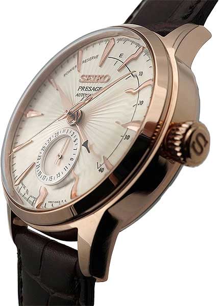 Модель Seiko SARY132 из коллекции Presage Cocktail Time — это элегантные автоматические часы, вдохновлённые атмосферой изысканных коктейль-баров. Корпус диаметром 40,5 мм выполнен из нержавеющей стали с тёплым розовым PVD-покрытиемPVDУльтратонкое покрытие наносится в технике вакуумного напыления, сочетает в себе нитрид титана особой прочности со слоем золота или оксида хрома. Несёт в себе декоративную или защитную функцию., придающим модели утончённый и благородный облик. Водозащита составляет 50 метров, что делает часы надёжными для повседневной носки.