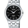 Мужские кварцевые часы Seiko — это надёжный и универсальный аксессуар. Корпус диаметром 36 мм выполнен из нержавеющей стали 316L. Циферблат чёрного цвета оформлен индексами и стрелками, включая центральную секундную стрелку. Циферблат защищён прочным закалённым минеральным стеклом Hardlex минеральным стекломМинеральное стеклоМинеральное стекло представляет собой искусственно выращенный минерал кварца. Такое стекло отличается особой устойчивостью к повреждениям и царапинам. Уступает по некоторым качествам сапфировому стеклу.. Механизм — кварцевый калибр 7N01 с высокой точностью хода (±10–15 сек. в месяц). Часы оснащены стальным браслетом на раскладной застёжкеРаскладная застёжкаТакой тип застёжки используется только на браслетах из металла. Она никогда не раскрывается полностью, происходит разделение на 2 и более частей. Раскладывающая застёжка снизит вероятность потери часов к минимуму. с фиксатором. Водонепроницаемость 50 м позволяет использовать часы в повседневных условиях. Идеальный выбор для тех, кто ценит японское качество и классический дизайн.