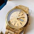 Seiko 5 SNKN96J1 — мужская автоматическая модель, выполненная в эффектном золотистом оформлении. Корпус диаметром 42 мм и браслет изготовлены из нержавеющей стали с прочным IPIP-покрытиеМетод ионного напыления. Демонстрирует повышенную устойчивость к истиранию, окислению и химическим веществам. Под воздействием высокого давления и температуры около 1500°C молекулы металла надёжно соединяются с частицами корпуса часов.-покрытием золотого цвета, придающим часам выразительный характер. Защитную функцию выполняет минеральное стеклоМинеральное стеклоМинеральное стекло представляет собой искусственно выращенный минерал кварца. Такое стекло отличается особой устойчивостью к повреждениям и царапинам. Уступает по некоторым качествам сапфировому стеклу. Hardlex, устойчивое к повседневным повреждениям, а прозрачная задняя крышка позволяет наблюдать за работой механизма. В основе модели лежит автоматический калибр 7S26 с функциями часов, минут, секунд, даты и дня недели. Водозащита составляет 50 м, достаточную для защиты от брызг и дождя. Золотистый циферблат оформлен с аккуратными индексами и стрелками, покрытыми люминесцентным покрытиемЛюминесцентное покрытиеПозволяет считывать показания времени в темноте. Производители наносят на стрелки, часовые индексы, безель или поверхность циферблата светонакопительный состав, дающий холодное свечение. для удобства в условиях слабого освещения. Браслет дополнен раскладной застёжкойРаскладная застёжкаТакой тип застёжки используется только на браслетах из металла. Она никогда не раскрывается полностью, происходит разделение на 2 и более частей. Раскладывающая застёжка снизит вероятность потери часов к минимуму., обеспечивающей надёжную фиксацию и комфорт в носке.