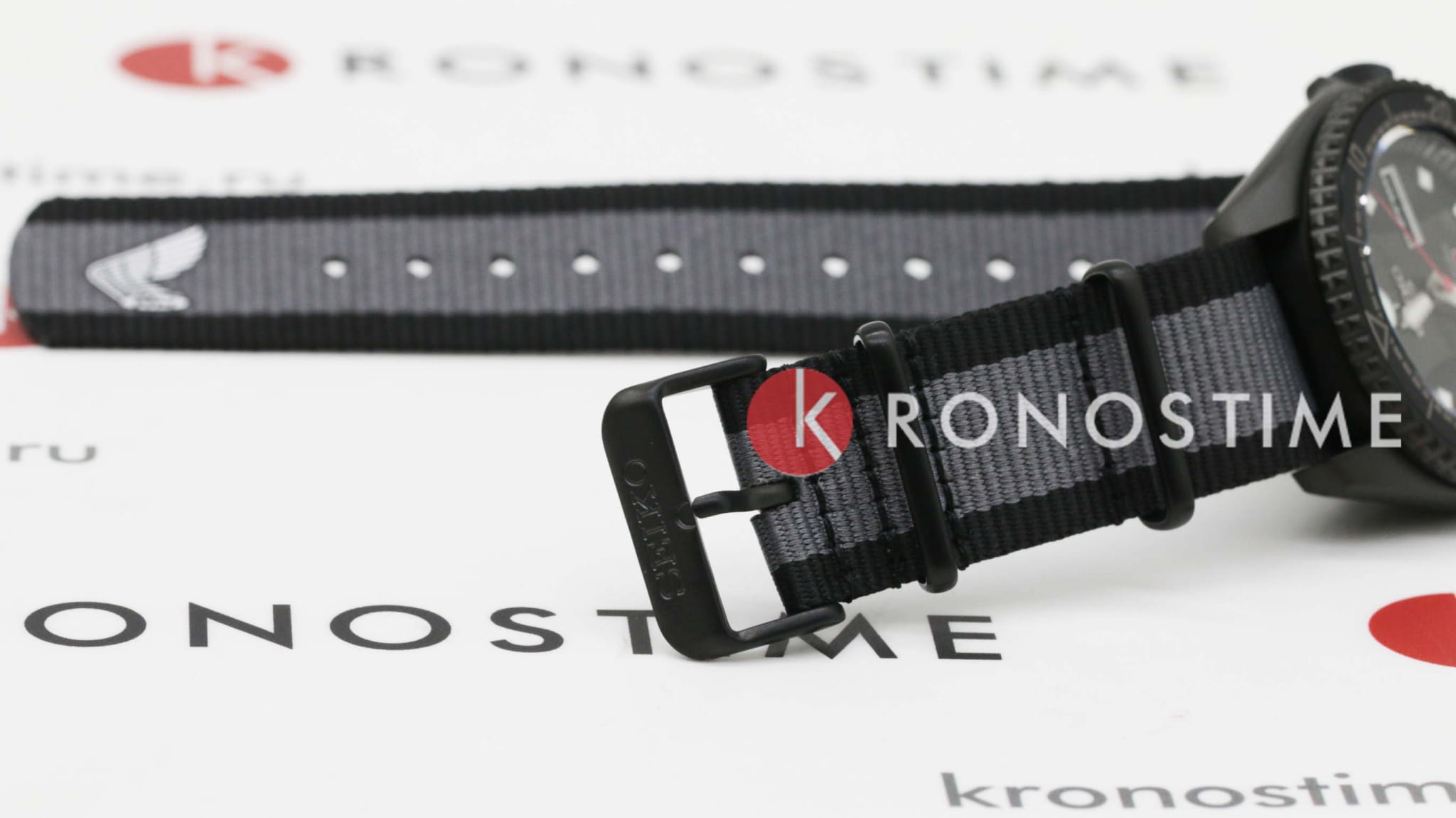 Водозащита 100 метров (10 бар) позволяет использовать часы для плавания и других водных видов спорта. Чёрный нейлоновый ремешок с логотипами Super Cub и Honda и раскладной застёжкойРаскладная застёжкаТакой тип застёжки используется только на браслетах из металла. Она никогда не раскрывается полностью, происходит разделение на 2 и более частей. Раскладывающая застёжка снизит вероятность потери часов к минимуму. обеспечивает комфортное ношение и надёжную фиксацию на запястье. ​​
