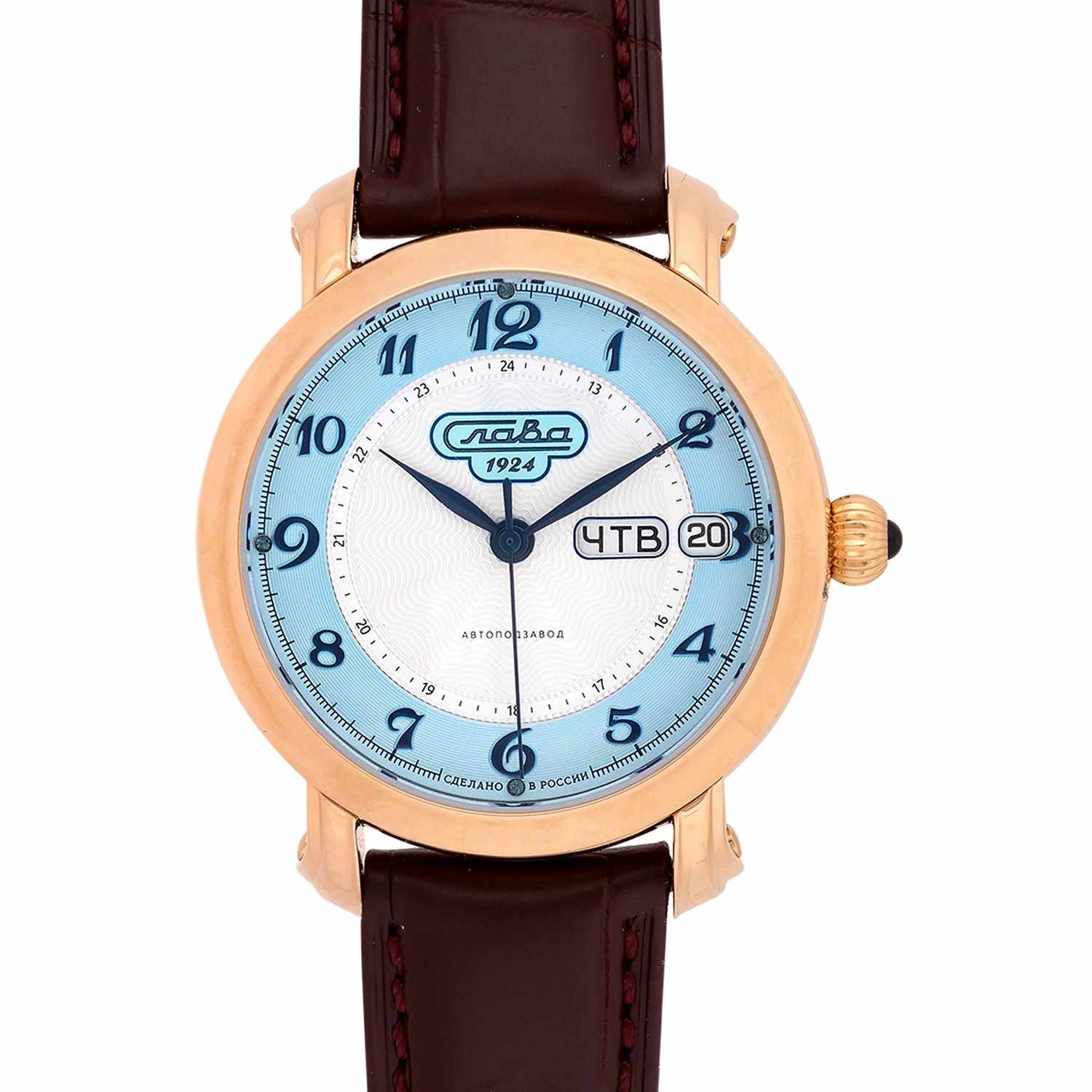 Наручные часы Слава Слава России 2443616/300-2427 — воплощение классического стиля и исключительного качества, произведенные в России. Эта модель из лимитированной коллекции, выпущенной в количестве всего 300 экземпляров, станет великолепным дополнением к вашему образу. Часы оснащены надежным механическим механизмом "Слава 2427" с автоподзаводом, обеспечивающим точный ход и оснащены двойным календарем, что позволяет всегда быть в курсе текущей даты. Корпус из нержавеющей стали с золотистым PVDPVDУльтратонкое покрытие наносится в технике вакуумного напыления, сочетает в себе нитрид титана особой прочности со слоем золота или оксида хрома. Несёт в себе декоративную или защитную функцию. покрытием диаметром 41 мм и толщиной 14,2 мм отличается высокой прочностью и водозащитой до 5 ATM. Серебристо-голубой циферблат с арабскими цифрами защищен сапфировым стекломСапфировое стеклоПрочный и надёжный материал из кристалла сапфира синтетического происхождения, характеризующийся особой твёрдостью и устойчивостью к царапинам и повреждениям., устойчивым к царапинам, что позволяет надолго сохранить безупречный вид часов. На 3 часах расположено окошко с указателем даты и дня недели. Кожаный ремень из крокодила с застежкой «бабочка»Застёжка "бабочка"Такой вид застёжки дополняется предохранителями, помогающими избежать случайного раскрытия браслета. Обладают изящным исполнением. добавляет элегантности и комфорта, создавая ощущение роскоши и изысканности. Эта модель станет идеальным выбором для тех, кто ценит традиции и высокое качество в сочетании с современным дизайном.