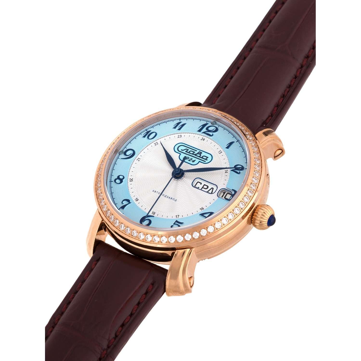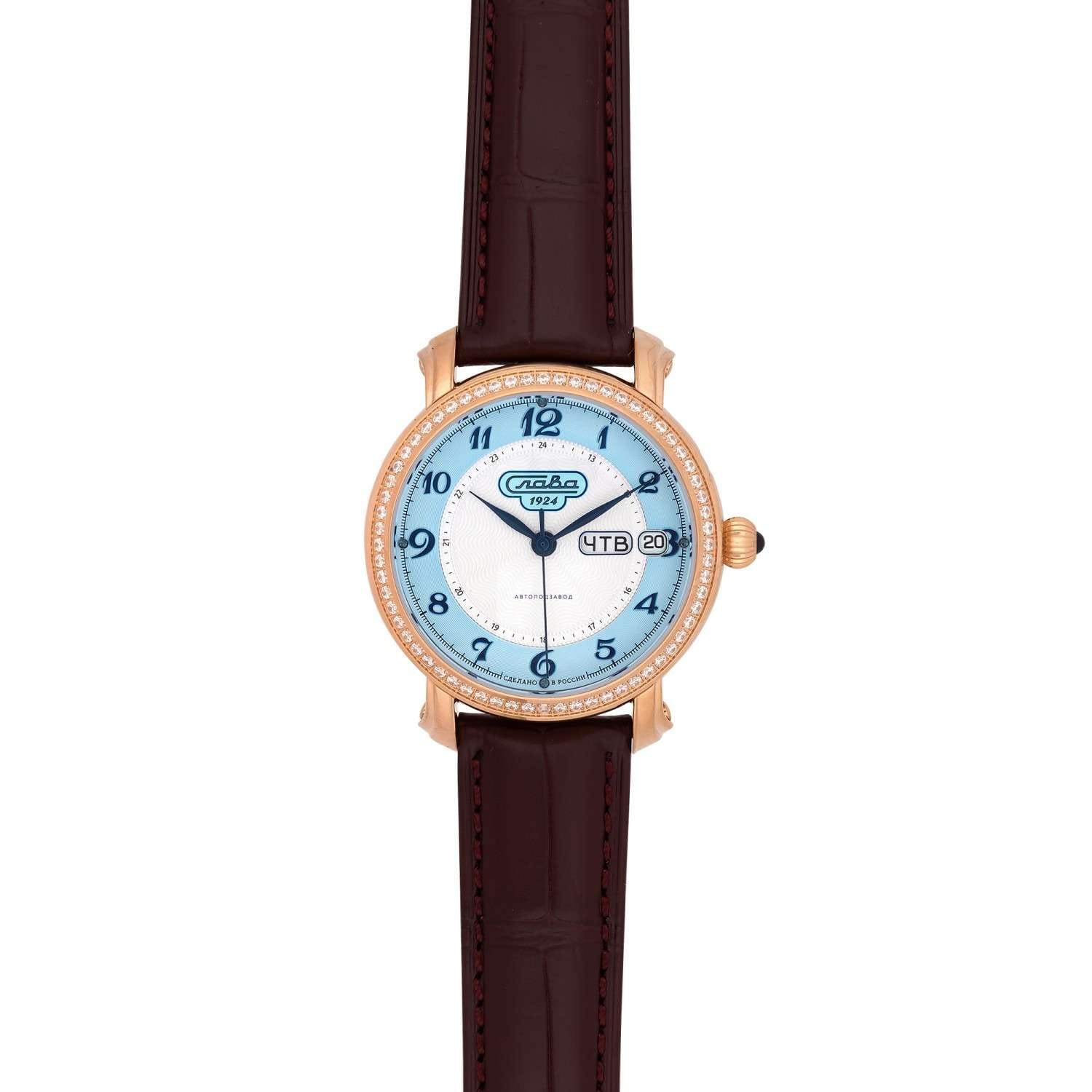 Наручные часы Слава Слава России 7443616/300-2427-68 — воплощение классического стиля и исключительного качества, произведенные в России. Эта модель из лимитированной коллекции станет великолепным дополнением к вашему образу. Часы оснащены надежным механическим механизмом "Слава 2427" с автоподзаводом, обеспечивающим точный ход и оснащены двойным календарем, что позволяет всегда быть в курсе текущей даты. Корпус из нержавеющей стали с золотистым PVDPVDУльтратонкое покрытие наносится в технике вакуумного напыления, сочетает в себе нитрид титана особой прочности со слоем золота или оксида хрома. Несёт в себе декоративную или защитную функцию.-покрытием диаметром 41 мм и толщиной 14,2 мм отличается высокой прочностью и водозащитой до 5 ATM. БезельБезельВнешний ободок, закрепляющий стекло. В спортивных часах так называется поворотное кольцо с делениями на циферблате, выполняет роль таймера – замеряет отрезки времени на шкале. Неподвижный безель – элемент декора. Однонаправленно вращающийся безель на дайверских часах позволяет фиксировать моменты погружения и выныривания на поверхность. часов с вставками из камней циркона. Серебристо-голубой циферблат с арабскими цифрами защищен сапфировым стекломСапфировое стеклоПрочный и надёжный материал из кристалла сапфира синтетического происхождения, характеризующийся особой твёрдостью и устойчивостью к царапинам и повреждениям., устойчивым к царапинам, что позволяет надолго сохранить безупречный вид часов. На 3 часах расположено окошко с указателем даты и дня недели. Кожаный ремень из крокодила с застежкой «бабочка»Застёжка "бабочка"Такой вид застёжки дополняется предохранителями, помогающими избежать случайного раскрытия браслета. Обладают изящным исполнением. добавляет элегантности и комфорта, создавая ощущение роскоши и изысканности. Эта модель станет идеальным выбором для тех, кто ценит традиции и высокое качество в сочетании с современным дизайном.
