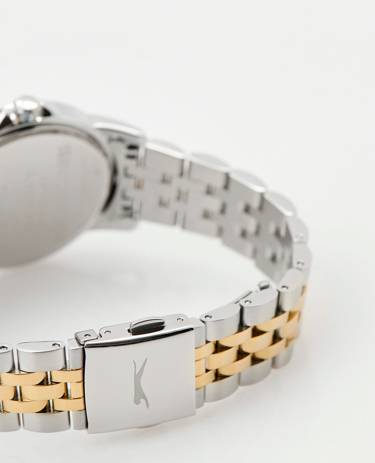 Женские наручные часы Slazenger SL.09.2009.4.09 представляют собой элегантное сочетание классического дизайна и функциональности современных технологий. Модель обладает круглым корпусом диаметром 36 мм, изготовленным из металлического сплава с IP-покрытиемIP-покрытиеМетод ионного напыления. Демонстрирует повышенную устойчивость к истиранию, окислению и химическим веществам. Под воздействием высокого давления и температуры около 1500°C молекулы металла надёжно соединяются с частицами корпуса часов., что обеспечивает высокую устойчивость к внешним воздействиям и привлекательный внешний вид. Интегрированный браслет на 5 звеньев с раскладной замокРаскладной замокДанный вариант застежки используется только на часах с металлическим браслетом. Отличительная особенность такого крепления в том, что длина браслета становится универсальной и вы можете самостоятельно отрегулировать нужный вам размер – застежка просто двигается по браслету часов. гарантирует комфортное ношение и безопасность . Зеленый циферблат дополнен тремя малыми циферблатами для отображения даты, дня недели и времени в формате 24 часа, а также защищен прочным минеральным стекломМинеральное стеклоМинеральное стекло представляет собой искусственно выращенный минерал кварца. Такое стекло отличается особой устойчивостью к повреждениям и царапинам. Уступает по некоторым качествам сапфировому стеклу.. Часы работают на кварцевом механизме, обеспечивающем точное время без необходимости подзаводки. Водонепроницаемость достигает 3 атмосфер (WR30), что позволяет использовать их в повседневной жизни, но не рекомендуется для плавания или водных видов спорта.