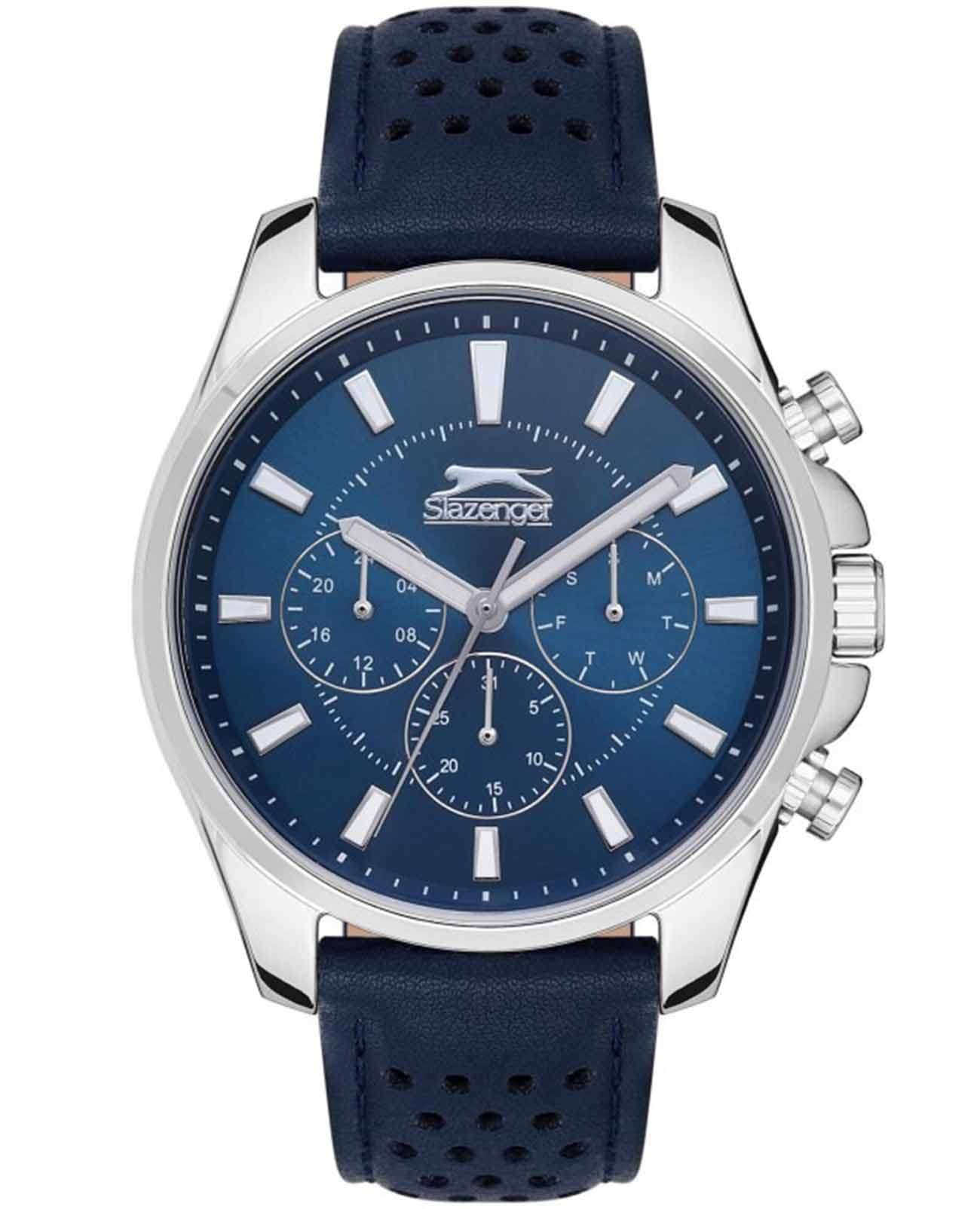Часы Slazenger SL.09.2134.2.04 воплощают в себе элегантность и практичность, идеально подходящие для современных мужчин. Их синий циферблат, защищенный минеральным стекломМинеральное стеклоМинеральное стекло представляет собой искусственно выращенный минерал кварца. Такое стекло отличается особой устойчивостью к повреждениям и царапинам. Уступает по некоторым качествам сапфировому стеклу., заключен серебристый глянцевый корпус диаметром 46 мм, который изготовлен из прочного суперметалла. Часы оснащены двойным форматом времени (12 и 24 часа), указателем дней недели и удобным окошком даты. Надежный кварцевый механизм обеспечивает точность, а водозащита 5 ATM делает их устойчивыми к воздействию воды. Ремень из натуральной кожи синего цвета имеет классическую застежку, что позволяет легко регулировать его длину на запястье. Люминесцентное покрытиеЛюминесцентное покрытиеПозволяет считывать показания времени в темноте. Производители наносят на стрелки, часовые индексы, безель или поверхность циферблата светонакопительный состав, дающий холодное свечение. на стрелках и метках обеспечивает отличную видимость в темноте.