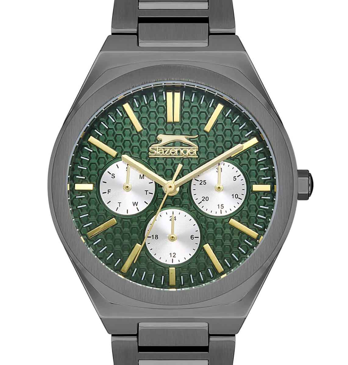 Элегантные женские часы Slazenger SL.09.2138.4.05 воплощают в себе утонченный стиль и функциональность. Их изящный круглый корпус из суперметалла с серым IP-покрытиемIP-покрытиеМетод ионного напыления. Демонстрирует повышенную устойчивость к истиранию, окислению и химическим веществам. Под воздействием высокого давления и температуры около 1500°C молекулы металла надёжно соединяются с частицами корпуса часов. гармонично сочетается с зеленым циферблатом и серебристыми малыми циферблатами, создавая неповторимый образ. Минималистичный дизайн подчеркивает чистоту линий и внимание к деталям. Циферблат защищен минеральным стекломМинеральное стеклоМинеральное стекло представляет собой искусственно выращенный минерал кварца. Такое стекло отличается особой устойчивостью к повреждениям и царапинам. Уступает по некоторым качествам сапфировому стеклу., устойчивым к царапинам. Часы имеют надежный кварцевый механизм, обеспечивающий точность хода.  Часы оснащены  24-часовым указателем времени, а также дней недели и даты - на дополнительных малых циферблатах. Серый браслет из суперметалла IP-покрытиемIP-покрытиеМетод ионного напыления. Демонстрирует повышенную устойчивость к истиранию, окислению и химическим веществам. Под воздействием высокого давления и температуры около 1500°C молекулы металла надёжно соединяются с частицами корпуса часов. идеально облегает запястье. Модель прекрасно дополнит как деловой, так и повседневный образ, став незаменимым аксессуаром для современной женщины, ценящей качество и стиль.