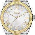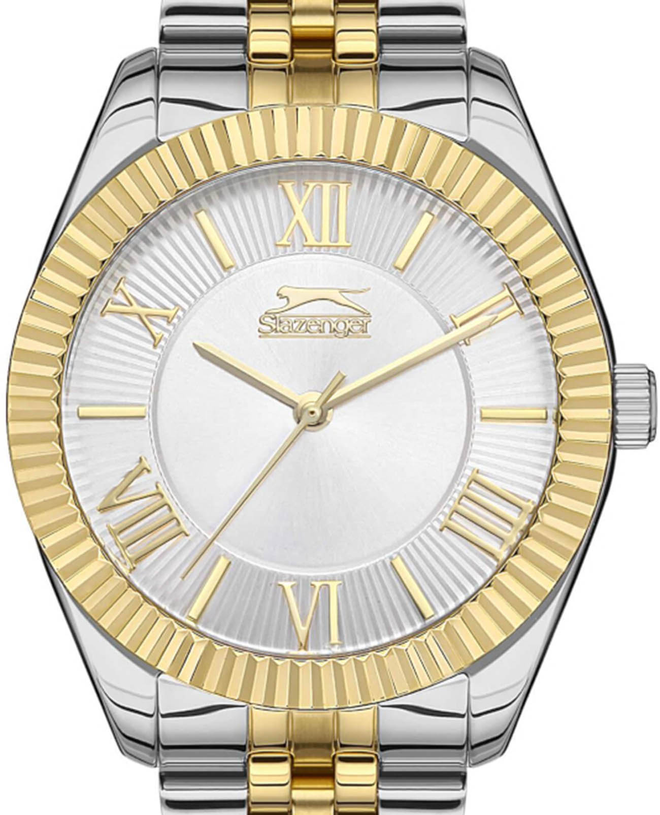 Женские кварцевые часы Slazenger SL.09.2150.3.02 — это стильный и элегантный аксессуар с корпусом из суперметалла с IP-покрытиемIP-покрытиеМетод ионного напыления. Демонстрирует повышенную устойчивость к истиранию, окислению и химическим веществам. Под воздействием высокого давления и температуры около 1500°C молекулы металла надёжно соединяются с частицами корпуса часов.. Корпус круглой формы защищён минеральным стекломМинеральное стеклоМинеральное стекло представляет собой искусственно выращенный минерал кварца. Такое стекло отличается особой устойчивостью к повреждениям и царапинам. Уступает по некоторым качествам сапфировому стеклу.. Циферблат серебристого цвета оформлен римскими цифрами и метками, придающими модели классический вид. Браслет из суперметалла комбинированного цвета — серебристого и золотистого — фиксируется на раскладной застёжкеРаскладная застёжкаТакой тип застёжки используется только на браслетах из металла. Она никогда не раскрывается полностью, происходит разделение на 2 и более частей. Раскладывающая застёжка снизит вероятность потери часов к минимуму., обеспечивая удобство и надёжность ношения. Часы сочетают в себе современный дизайн и надёжность, идеально подходя для повседневного и делового образа. Водонепроницаемость 30 м позволяет использовать их в повседневных условиях, защищая от случайных брызг и капель дождя.
