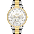 Часы Slazenger SL.09.2151.4.05 — это элегантный аксессуар, который прекрасно дополнит женственный образ. Эти наручные кварцевые часы сочетают в себе стиль и функциональность. Круглый корпус диаметром 35 мм изготовлен из суперметалла, который отличается повышенной прочностью. Неподвижный безельБезельВнешний ободок, закрепляющий стекло. В спортивных часах так называется поворотное кольцо с делениями на циферблате, выполняет роль таймера – замеряет отрезки времени на шкале. Неподвижный безель – элемент декора. Однонаправленно вращающийся безель на дайверских часах позволяет фиксировать моменты погружения и выныривания на поверхность. из суперметалла с золотистым IP-покрытиемIP-покрытиеМетод ионного напыления. Демонстрирует повышенную устойчивость к истиранию, окислению и химическим веществам. Под воздействием высокого давления и температуры около 1500°C молекулы металла надёжно соединяются с частицами корпуса часов.. Белый циферблат выполнен по технологии Sunray, что создает эффект солнечных лучей, и украшен фианитами, придающими часам особую изысканность. На циферблате расположены метки в виде штрихов и точек, а также логотип бренда. Время отображается в 12- и 24-часовом формате, а также предусмотрены отдельные индикаторы для дня недели и числа. Минеральное стеклоМинеральное стеклоМинеральное стекло представляет собой искусственно выращенный минерал кварца. Такое стекло отличается особой устойчивостью к повреждениям и царапинам. Уступает по некоторым качествам сапфировому стеклу. обеспечивает надежную защиту от царапин. Водозащита уровня 30WR позволяет защищать часы от случайных попаданий воды. Металлический браслет с частичным золотистым IP-покрытиемIP-покрытиеМетод ионного напыления. Демонстрирует повышенную устойчивость к истиранию, окислению и химическим веществам. Под воздействием высокого давления и температуры около 1500°C молекулы металла надёжно соединяются с частицами корпуса часов. и раскладной застёжкойРаскладная застёжкаТакой тип застёжки используется только на браслетах из металла. Она никогда не раскрывается полностью, происходит разделение на 2 и более частей. Раскладывающая застёжка снизит вероятность потери часов к минимуму. гарантирует комфортное ношение и надежную фиксацию на запястье. Рифленая заводная головка добавляет удобства в управлении настройками. Эти часы станут идеальным выбором для тех, кто ценит сочетание классического дизайна и практичности.