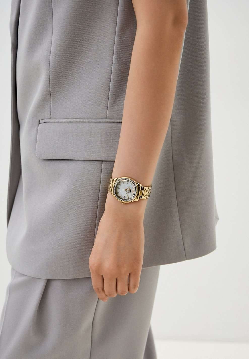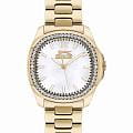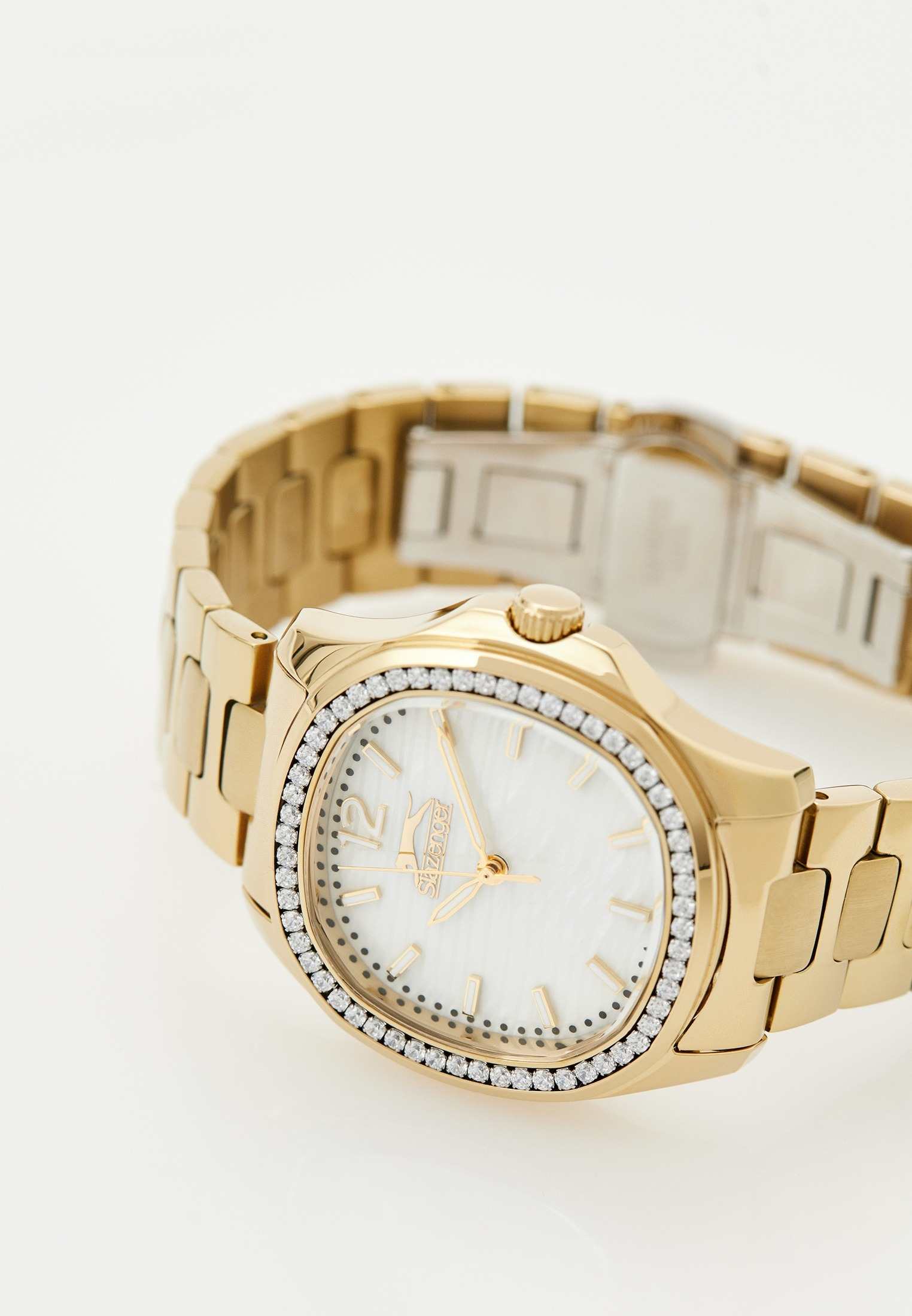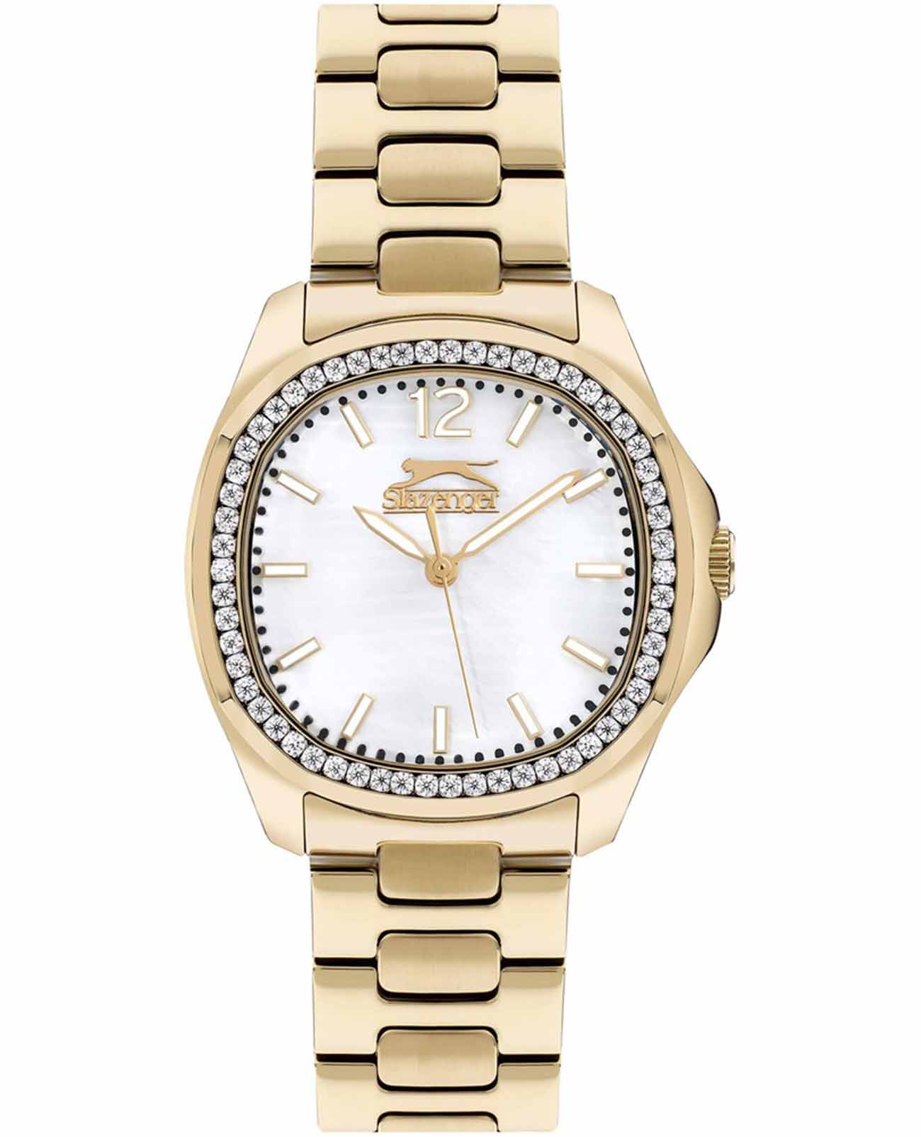 Часы Slazenger SL.09.2238.3.06 – это изысканный аксессуар, который станет стильным акцентом любого образа. Модель оснащена надежным кварцевым механизмом. Корпус из прочного металла с золотистым IP-покрытиемIP-покрытиеМетод ионного напыления. Демонстрирует повышенную устойчивость к истиранию, окислению и химическим веществам. Под воздействием высокого давления и температуры около 1500°C молекулы металла надёжно соединяются с частицами корпуса часов. размером 34х34 мм украшен россыпью сверкающих фианитов по безелюБезельВнешний ободок, закрепляющий стекло. В спортивных часах так называется поворотное кольцо с делениями на циферблате, выполняет роль таймера – замеряет отрезки времени на шкале. Неподвижный безель – элемент декора. Однонаправленно вращающийся безель на дайверских часах позволяет фиксировать моменты погружения и выныривания на поверхность., что придает часам особое сияние и элегантность. Белый перламутровый циферблат с логотипом бренда защищен стойким к царапинам минеральным стекломМинеральное стеклоМинеральное стекло представляет собой искусственно выращенный минерал кварца. Такое стекло отличается особой устойчивостью к повреждениям и царапинам. Уступает по некоторым качествам сапфировому стеклу.. Четкие часовые метки в виде лаконичных штрихов и крупная арабская цифра 12 обеспечивают удобство чтения времени. Заводная головка с рифлением дополнена защитой для повышения долговечности. Металлический браслет с золотистым IP-покрытиемIP-покрытиеМетод ионного напыления. Демонстрирует повышенную устойчивость к истиранию, окислению и химическим веществам. Под воздействием высокого давления и температуры около 1500°C молекулы металла надёжно соединяются с частицами корпуса часов. шириной 18 мм надежно фиксируется на запястье с помощью застежки «бабочка»Застёжка "бабочка"Такой вид застёжки дополняется предохранителями, помогающими избежать случайного раскрытия браслета. Обладают изящным исполнением. . Для удобства использования в темное время суток предусмотрено люминесцентное покрытиеЛюминесцентное покрытиеПозволяет считывать показания времени в темноте. Производители наносят на стрелки, часовые индексы, безель или поверхность циферблата светонакопительный состав, дающий холодное свечение. стрелок. Водозащита 30WR позволяет не беспокоиться о случайных брызгах. Вес изделия составляет 92 грамма, что делает часы комфортными для ежедневного ношения. Эти часы идеально подойдут для тех, кто ценит гармонию стиля, качества и функциональности.