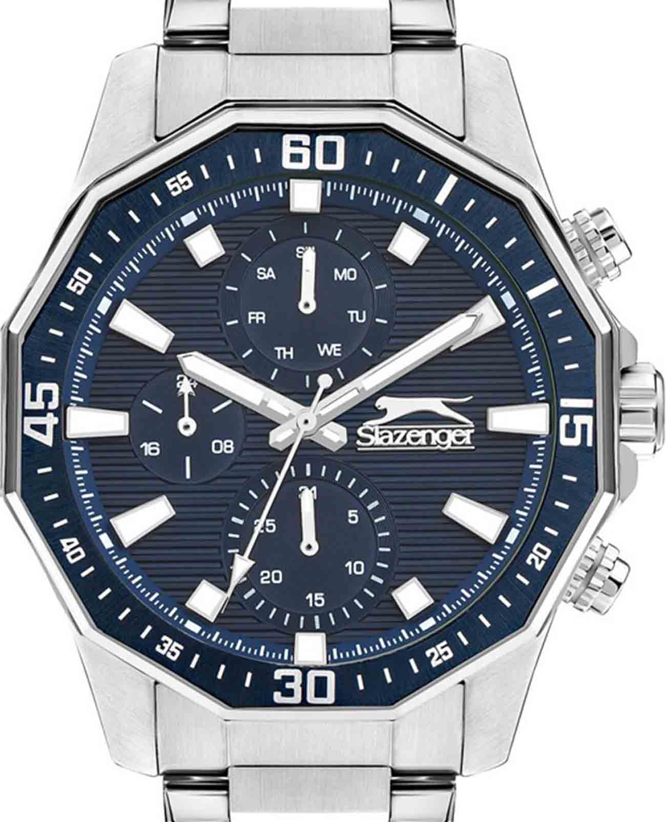 Стильные наручные часы Slazenger SL.09.2297.2.01 созданы для ценителей надежности и современного дизайна. Классический металлический корпус и серебристый браслет гармонично сочетают элегантность и практичность. Кварцевый механизм обеспечивает точность хода, а минеральное стеклоМинеральное стеклоМинеральное стекло представляет собой искусственно выращенный минерал кварца. Такое стекло отличается особой устойчивостью к повреждениям и царапинам. Уступает по некоторым качествам сапфировому стеклу. защищает циферблат от царапин. Особое внимание привлекает безельБезельВнешний ободок, закрепляющий стекло. В спортивных часах так называется поворотное кольцо с делениями на циферблате, выполняет роль таймера – замеряет отрезки времени на шкале. Неподвижный безель – элемент декора. Однонаправленно вращающийся безель на дайверских часах позволяет фиксировать моменты погружения и выныривания на поверхность. с синим IP-покрытиемIP-покрытиеМетод ионного напыления. Демонстрирует повышенную устойчивость к истиранию, окислению и химическим веществам. Под воздействием высокого давления и температуры около 1500°C молекулы металла надёжно соединяются с частицами корпуса часов.. На дополнительных малых циферблатах отображаются день недели, число и текущее время в 24-часовом формате. Модель оснащена люминесцентным покрытиемЛюминесцентное покрытиеПозволяет считывать показания времени в темноте. Производители наносят на стрелки, часовые индексы, безель или поверхность циферблата светонакопительный состав, дающий холодное свечение. стрелок и меток, что облегчает считывание времени в темноте. Водозащита 50 метров позволяет не снимать часы во время дождя или мытья рук. Заводная головка оснащена защитой, а задняя крышка завинчивается для дополнительной безопасности. Браслет снабжен удобной раскладной застёжкойРаскладная застёжкаТакой тип застёжки используется только на браслетах из металла. Она никогда не раскрывается полностью, происходит разделение на 2 и более частей. Раскладывающая застёжка снизит вероятность потери часов к минимуму.. Диаметр корпуса составляет 43 мм, толщина — 13 мм, ширина ремешка 22 мм, а вес часов — 167 грамм.