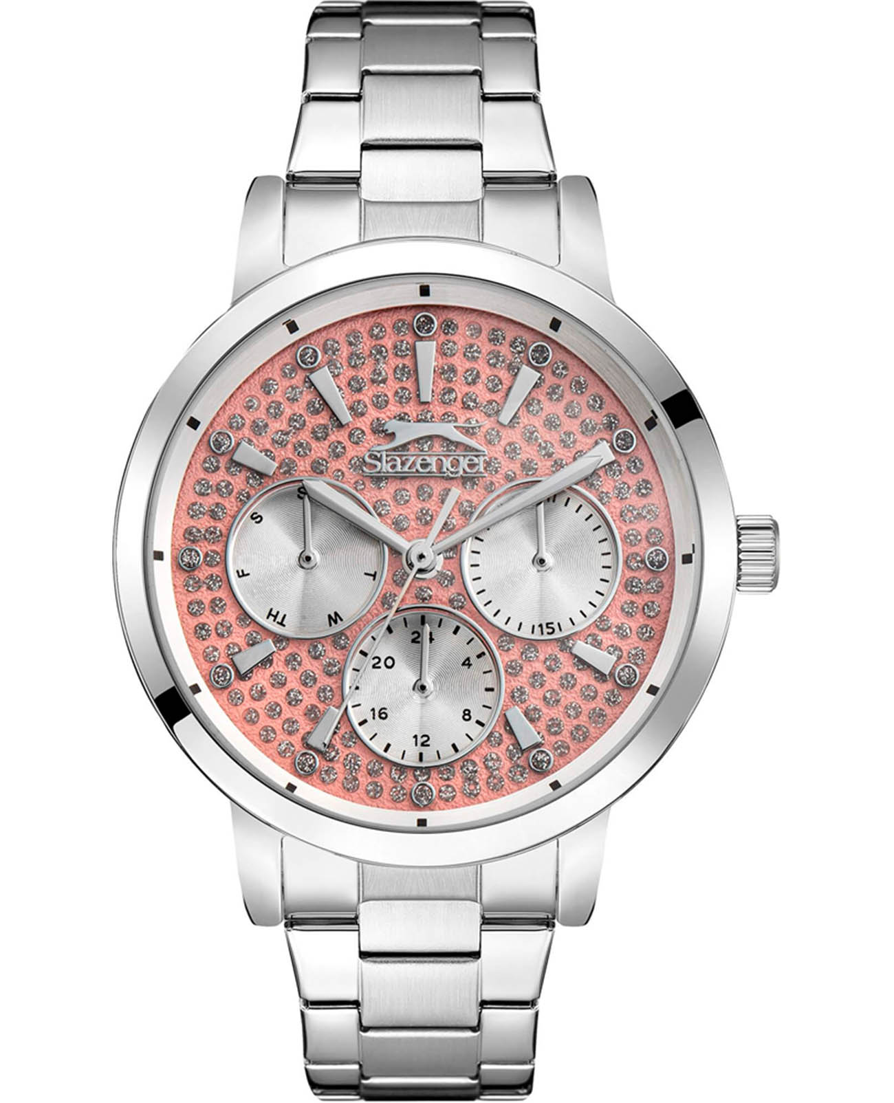 Женские кварцевые часы Slazenger SL.09.2299.3.01 — это элегантный и функциональный аксессуар, сочетающий стиль и надёжность. Корпус и браслет выполнены из суперметалла, защищён минеральным стекломМинеральное стеклоМинеральное стекло представляет собой искусственно выращенный минерал кварца. Такое стекло отличается особой устойчивостью к повреждениям и царапинам. Уступает по некоторым качествам сапфировому стеклу.. Циферблат розового цвета украшен фианитами, придающими модели изысканное сияние. Часы оснащены вынесенными малыми циферблатами для индикации дня недели, даты и времени в 24-часовом формате. Браслет фиксируется на раскладной застёжкеРаскладная застёжкаТакой тип застёжки используется только на браслетах из металла. Она никогда не раскрывается полностью, происходит разделение на 2 и более частей. Раскладывающая застёжка снизит вероятность потери часов к минимуму., обеспечивая удобство и надёжность ношения. Водонепроницаемость 30 м позволяет использовать часы в повседневных условиях, защищая от случайных брызг и капель дождя. Модель подчёркивает женственность и индивидуальность, идеально подходя как для повседневного, так и для торжественного образа.