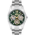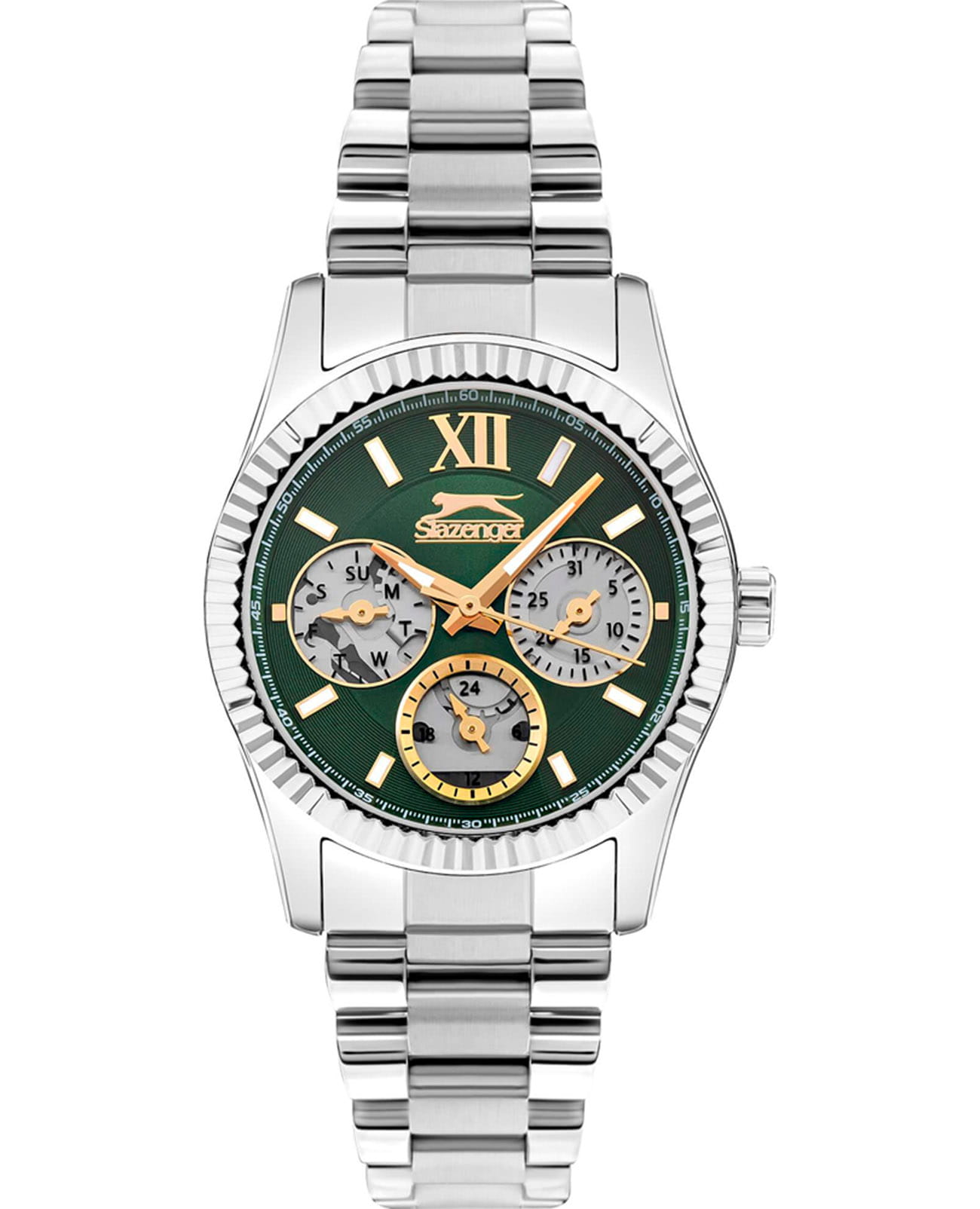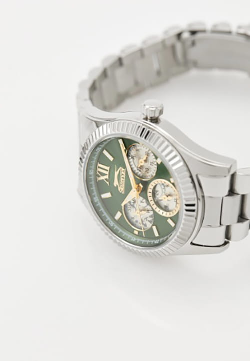 Женские кварцевые часы Slazenger SL.09.2317.4.03 — это выразительный и функциональный аксессуар, сочетающий стиль, прочность и насыщенную комплектацию. Корпус и браслет выполнены из суперметалла. Циферблат зелёного цвета защищён минеральным стекломМинеральное стеклоМинеральное стекло представляет собой искусственно выращенный минерал кварца. Такое стекло отличается особой устойчивостью к повреждениям и царапинам. Уступает по некоторым качествам сапфировому стеклу. и оформлен с вынесенными малыми циферблатами для индикации дня недели, даты и времени в 24-часовом формате. Стрелки и метки оснащены люминесцентным покрытиемЛюминесцентное покрытиеПозволяет считывать показания времени в темноте. Производители наносят на стрелки, часовые индексы, безель или поверхность циферблата светонакопительный состав, дающий холодное свечение., обеспечивающим хорошую читаемость в темноте. Браслет из суперметалла фиксируется на раскладной застёжкеРаскладная застёжкаТакой тип застёжки используется только на браслетах из металла. Она никогда не раскрывается полностью, происходит разделение на 2 и более частей. Раскладывающая застёжка снизит вероятность потери часов к минимуму., обеспечивая удобство и надёжность ношения. Водонепроницаемость 30 м позволяет использовать часы в повседневных условиях, защищая от случайных брызг и капель дождя. Модель подчёркивает индивидуальность владельца и идеально подходит как для повседневного, так и для торжественного образа.