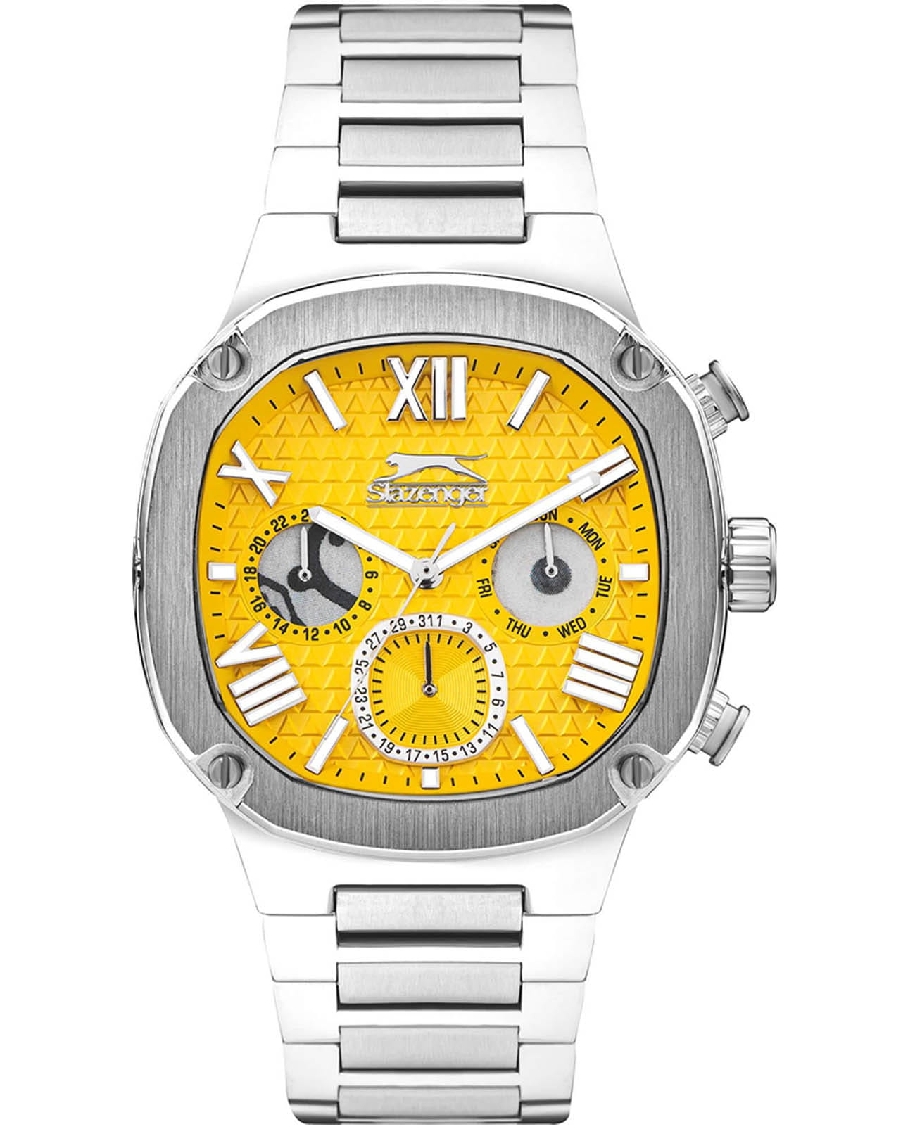 Мужские кварцевые часы Slazenger SL.09.2320.2.06 — это выразительный и функциональный аксессуар, сочетающий стиль, прочность и насыщенную комплектацию. Корпус и браслет выполнены из суперметалла, а циферблат частично оформлен в желтых тонах. Циферблат защищён минеральным стекломМинеральное стеклоМинеральное стекло представляет собой искусственно выращенный минерал кварца. Такое стекло отличается особой устойчивостью к повреждениям и царапинам. Уступает по некоторым качествам сапфировому стеклу. и дополнен вынесенными малыми циферблатами для индикации дня недели, даты и времени в 24-часовом формате. Стрелки и метки оснащены люминесцентным покрытиемЛюминесцентное покрытиеПозволяет считывать показания времени в темноте. Производители наносят на стрелки, часовые индексы, безель или поверхность циферблата светонакопительный состав, дающий холодное свечение., обеспечивающим хорошую читаемость в темноте. Браслет из суперметалла фиксируется на раскладной застёжкеРаскладная застёжкаТакой тип застёжки используется только на браслетах из металла. Она никогда не раскрывается полностью, происходит разделение на 2 и более частей. Раскладывающая застёжка снизит вероятность потери часов к минимуму., обеспечивая удобство и безопасность ношения. Водонепроницаемость 50 м позволяет использовать часы в повседневных условиях, защищая от случайных брызг и капель дождя. Модель подчёркивает индивидуальность владельца и идеально подходит как для повседневного, так и для делового образа.