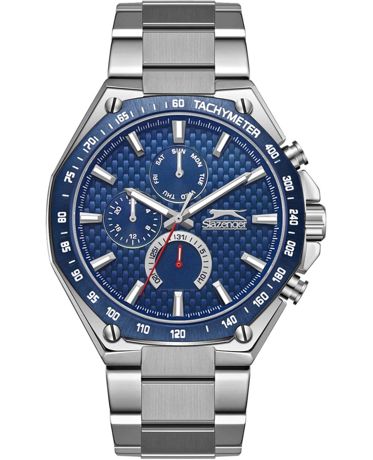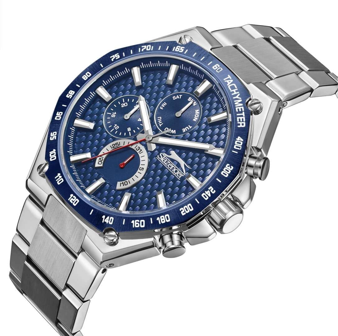 Мужские кварцевые часы Slazenger SL.09.2325.2.02 — это выразительный и функциональный аксессуар, сочетающий стиль, прочность и насыщенную комплектацию. Корпус и браслет выполнены из суперметалла, а циферблат оформлен в синих тонах. Циферблат защищён минеральным стекломМинеральное стеклоМинеральное стекло представляет собой искусственно выращенный минерал кварца. Такое стекло отличается особой устойчивостью к повреждениям и царапинам. Уступает по некоторым качествам сапфировому стеклу. и дополнен вынесенными малыми циферблатами для индикации дня недели, даты и времени в 24-часовом формате. БезельБезельВнешний ободок, закрепляющий стекло. В спортивных часах так называется поворотное кольцо с делениями на циферблате, выполняет роль таймера – замеряет отрезки времени на шкале. Неподвижный безель – элемент декора. Однонаправленно вращающийся безель на дайверских часах позволяет фиксировать моменты погружения и выныривания на поверхность. с IP-покрытиемIP-покрытиеМетод ионного напыления. Демонстрирует повышенную устойчивость к истиранию, окислению и химическим веществам. Под воздействием высокого давления и температуры около 1500°C молекулы металла надёжно соединяются с частицами корпуса часов. дополнен тахиметромТахиметрРазмеченная шкала, располагается на ободке или безеле часов. Тахиметр позволяет рассчитать скорость на определённом участке пути, расстояние измеряется в километрах или милях.. Стрелки и метки оснащены люминесцентным покрытиемЛюминесцентное покрытиеПозволяет считывать показания времени в темноте. Производители наносят на стрелки, часовые индексы, безель или поверхность циферблата светонакопительный состав, дающий холодное свечение., обеспечивающим хорошую читаемость в темноте.  Браслет из суперметалла фиксируется на раскладной застёжкеРаскладная застёжкаТакой тип застёжки используется только на браслетах из металла. Она никогда не раскрывается полностью, происходит разделение на 2 и более частей. Раскладывающая застёжка снизит вероятность потери часов к минимуму., обеспечивая удобство и безопасность ношения. Водонепроницаемость 50 м позволяет использовать часы в повседневных условиях, защищая от случайных брызг и капель дождя. Модель подчёркивает индивидуальность владельца и идеально подходит как для повседневного, так и для делового образа.