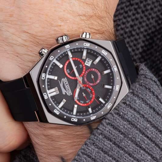 Мужские элегантные наручные часы Slazenger SL.09.2341.2.01 сочетают в себе современный стиль и функциональность. Стильный корпус выполнен из нержавеющей стали с неповоротный безелемБезельВнешний ободок, закрепляющий стекло. В спортивных часах так называется поворотное кольцо с делениями на циферблате, выполняет роль таймера – замеряет отрезки времени на шкале. Неподвижный безель – элемент декора. Однонаправленно вращающийся безель на дайверских часах позволяет фиксировать моменты погружения и выныривания на поверхность. с IP-покрытиемIP-покрытиеМетод ионного напыления. Демонстрирует повышенную устойчивость к истиранию, окислению и химическим веществам. Под воздействием высокого давления и температуры около 1500°C молекулы металла надёжно соединяются с частицами корпуса часов., придающий модели дополнительную прочность и элегантный внешний вид. Изысканный циферблат защищён минеральным стекломМинеральное стеклоМинеральное стекло представляет собой искусственно выращенный минерал кварца. Такое стекло отличается особой устойчивостью к повреждениям и царапинам. Уступает по некоторым качествам сапфировому стеклу., устойчивым к царапинам и повреждениям, и дополнен вынесенными малыми циферблатами для индикации дня недели и времени в 24-часовом формате. Водонепроницаемость 5 АТМ позволяет использовать часы в повседневных условиях — при мытье рук или под лёгким дождём. Ремень из силикона со стандартной застежкой, обеспечивающий надёжную фиксацию и комфорт при ношении. Окошко даты находится в положении между 4 и 5 часами. Cтрелки и метки покрыты люминесцентным покрытиемЛюминесцентное покрытиеПозволяет считывать показания времени в темноте. Производители наносят на стрелки, часовые индексы, безель или поверхность циферблата светонакопительный состав, дающий холодное свечение. для читаемости в условиях недостаточного освещения. Эта модель идеально подходит для мужчин, ценящих стиль, функциональность и надёжность в одном аксессуаре.