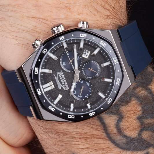 Мужские элегантные наручные часы Slazenger SL.09.2341.2.03 сочетают в себе современный стиль и функциональность. Стильный корпус выполнен из нержавеющей стали с неповоротный безелемБезельВнешний ободок, закрепляющий стекло. В спортивных часах так называется поворотное кольцо с делениями на циферблате, выполняет роль таймера – замеряет отрезки времени на шкале. Неподвижный безель – элемент декора. Однонаправленно вращающийся безель на дайверских часах позволяет фиксировать моменты погружения и выныривания на поверхность. с IP-покрытиемIP-покрытиеМетод ионного напыления. Демонстрирует повышенную устойчивость к истиранию, окислению и химическим веществам. Под воздействием высокого давления и температуры около 1500°C молекулы металла надёжно соединяются с частицами корпуса часов., придающий модели дополнительную прочность и элегантный внешний вид. Изысканный циферблат защищён минеральным стекломМинеральное стеклоМинеральное стекло представляет собой искусственно выращенный минерал кварца. Такое стекло отличается особой устойчивостью к повреждениям и царапинам. Уступает по некоторым качествам сапфировому стеклу., устойчивым к царапинам и повреждениям, и дополнен вынесенными малыми циферблатами для индикации дня недели и времени в 24-часовом формате. Водонепроницаемость 5 АТМ позволяет использовать часы в повседневных условиях — при мытье рук или под лёгким дождём. Ремень из силикона со стандартной застежкой, обеспечивающий надёжную фиксацию и комфорт при ношении. Окошко даты находится в положении между 4 и 5 часами. Cтрелки и метки покрыты люминесцентным покрытиемЛюминесцентное покрытиеПозволяет считывать показания времени в темноте. Производители наносят на стрелки, часовые индексы, безель или поверхность циферблата светонакопительный состав, дающий холодное свечение. для читаемости в условиях недостаточного освещения. Эта модель идеально подходит для мужчин, ценящих стиль, функциональность и надёжность в одном аксессуаре.