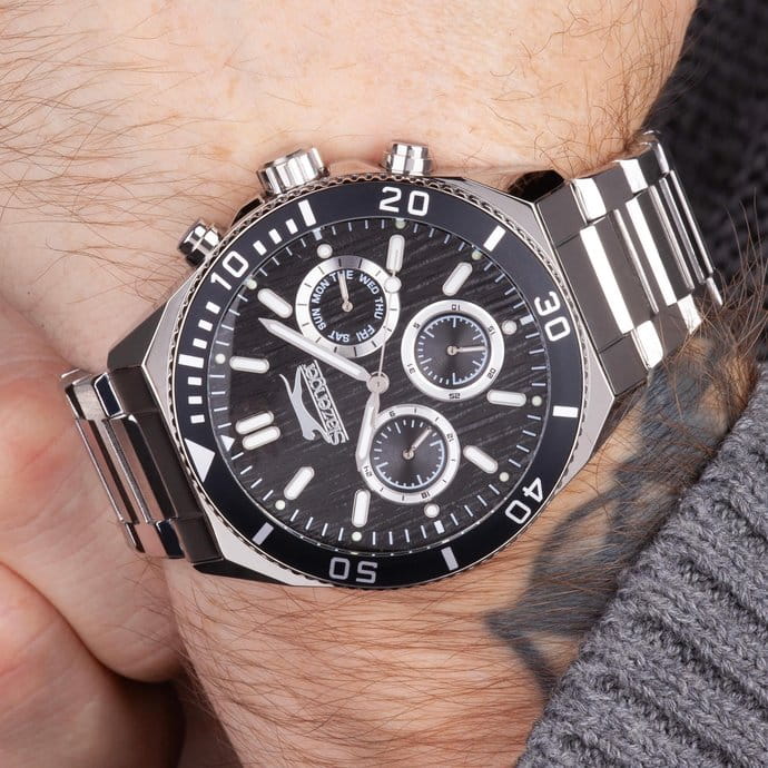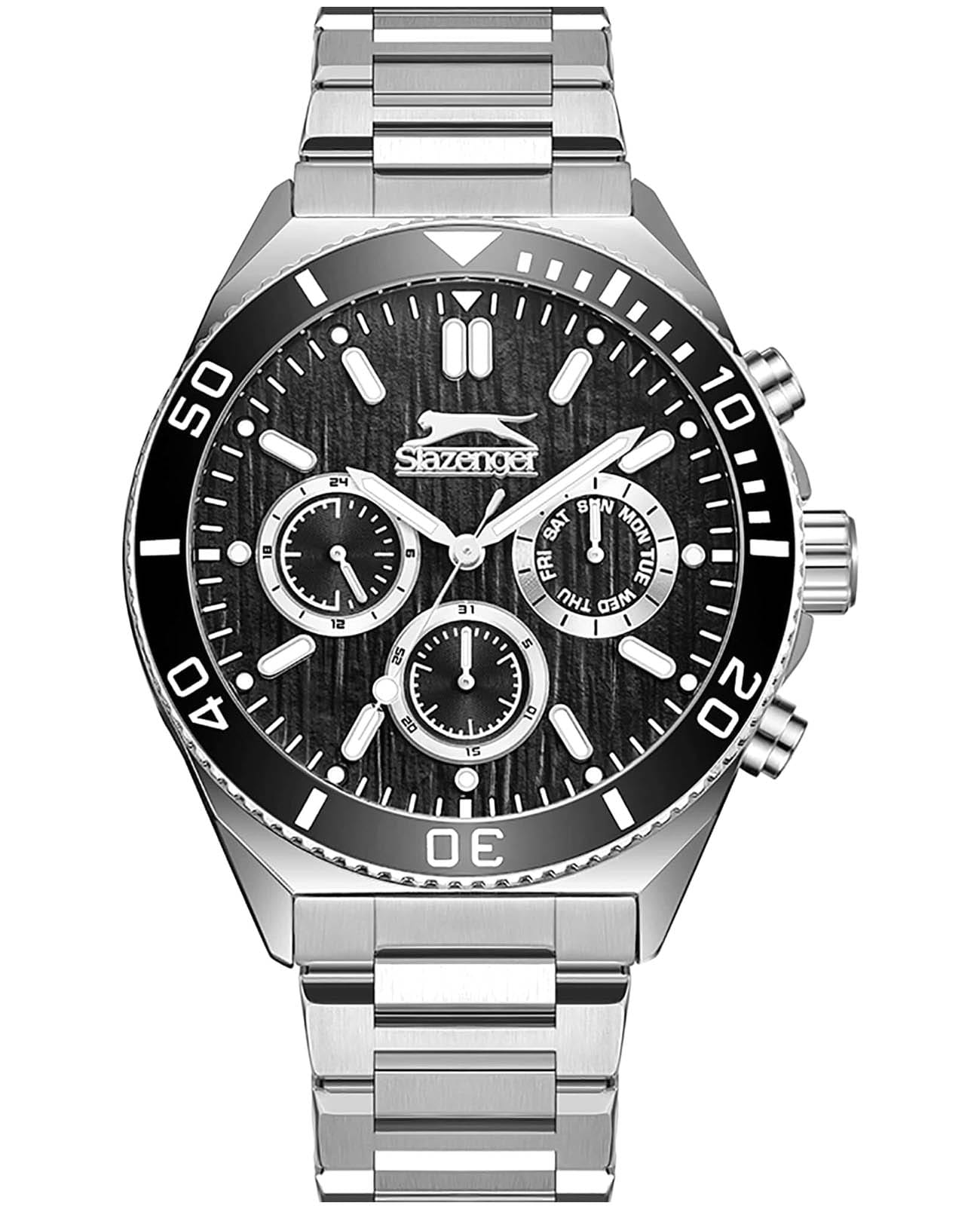 Мужские кварцевые часы Slazenger SL.09.2370.2.01 – идеальное сочетание классического дизайна и современных технологий, созданное для уверенных в себе мужчин. Корпус выполнен из суперметалла серебристого цвета, диаметром 44.5 мм и толщиной 13 мм, подчёркивает надежность модели и делает их идеальным аксессуаром для любой ситуации – будь то деловая встреча или повседневные выходы. Циферблат надёжно защищён минеральным стекломМинеральное стеклоМинеральное стекло представляет собой искусственно выращенный минерал кварца. Такое стекло отличается особой устойчивостью к повреждениям и царапинам. Уступает по некоторым качествам сапфировому стеклу., которое устойчиво к механическим повреждениям и сохраняет кристальную прозрачность. БезельБезельВнешний ободок, закрепляющий стекло. В спортивных часах так называется поворотное кольцо с делениями на циферблате, выполняет роль таймера – замеряет отрезки времени на шкале. Неподвижный безель – элемент декора. Однонаправленно вращающийся безель на дайверских часах позволяет фиксировать моменты погружения и выныривания на поверхность. с IP-покрытиемIP-покрытиеМетод ионного напыления. Демонстрирует повышенную устойчивость к истиранию, окислению и химическим веществам. Под воздействием высокого давления и температуры около 1500°C молекулы металла надёжно соединяются с частицами корпуса часов. черного цвета. Стальной браслет удобно облегает запястье и фиксируется с помощью раскладной застёжкиРаскладная застёжкаТакой тип застёжки используется только на браслетах из металла. Она никогда не раскрывается полностью, происходит разделение на 2 и более частей. Раскладывающая застёжка снизит вероятность потери часов к минимуму., обеспечивая надёжность и комфорт в повседневном ношении. Стрелки и метки покрыты люминесцентным покрытиемЛюминесцентное покрытиеПозволяет считывать показания времени в темноте. Производители наносят на стрелки, часовые индексы, безель или поверхность циферблата светонакопительный состав, дающий холодное свечение., обеспечивающим отличную читаемость в темноте. Эти часы станут не просто аксессуаром, а надежным спутником в любой ситуации, подчеркивая ваш безупречный вкус и деловой стиль. Вынесенный циферблат с 24-х часовым указателем времени. Водозащита 50 метров позволит защитить корпус от случайных брызг или капель дождя.