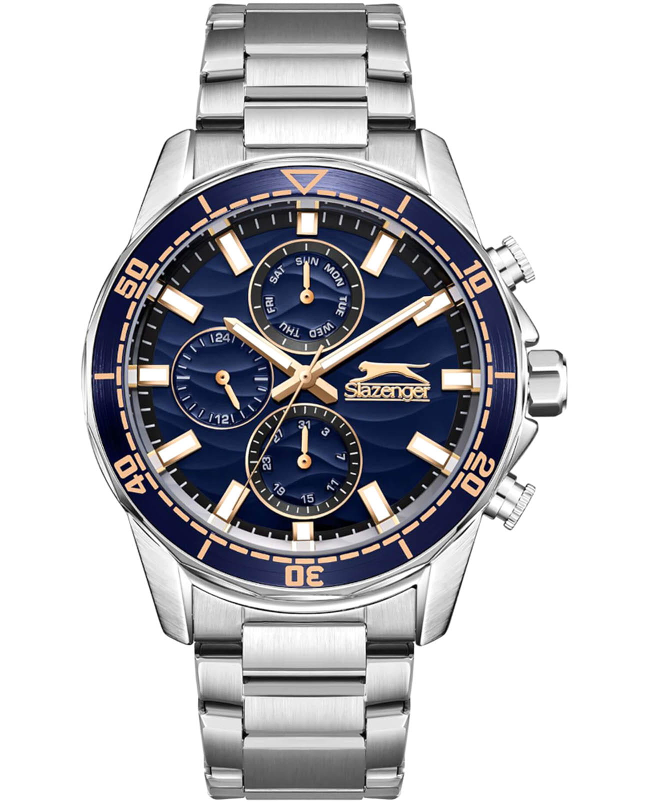 Мужские кварцевые часы Slazenger — это выразительный и функциональный аксессуар. Корпус диаметром 41,5 мм и толщиной 13 мм выполнен из суперметалла. Циферблат синего цвета оформлен индексами и стрелками. Циферблат защищён минеральным стекломМинеральное стеклоМинеральное стекло представляет собой искусственно выращенный минерал кварца. Такое стекло отличается особой устойчивостью к повреждениям и царапинам. Уступает по некоторым качествам сапфировому стеклу.. Механизм — кварцевый. Часы оснащены индикацией дня недели, даты и 12/24-часового формата времени. Стрелки и метки с люминесцентным покрытиемЛюминесцентное покрытиеПозволяет считывать показания времени в темноте. Производители наносят на стрелки, часовые индексы, безель или поверхность циферблата светонакопительный состав, дающий холодное свечение., обеспечивающим хорошую читаемость в темноте. Часы оснащены браслетом из суперметалла с раскладной застёжкойРаскладная застёжкаТакой тип застёжки используется только на браслетах из металла. Она никогда не раскрывается полностью, происходит разделение на 2 и более частей. Раскладывающая застёжка снизит вероятность потери часов к минимуму.. Водонепроницаемость 100 м позволяет использовать часы для плавания и повседневного ношения. Гарантия — 12 месяцев. Идеальный выбор для тех, кто ценит стиль, функциональность и качество.