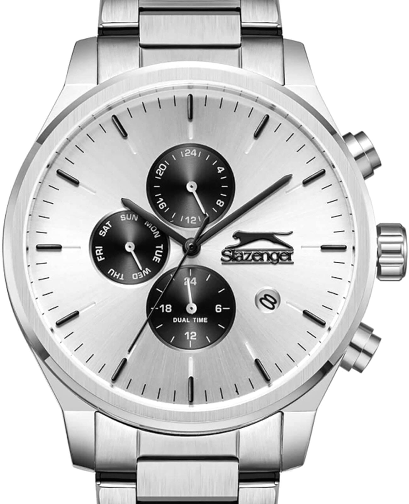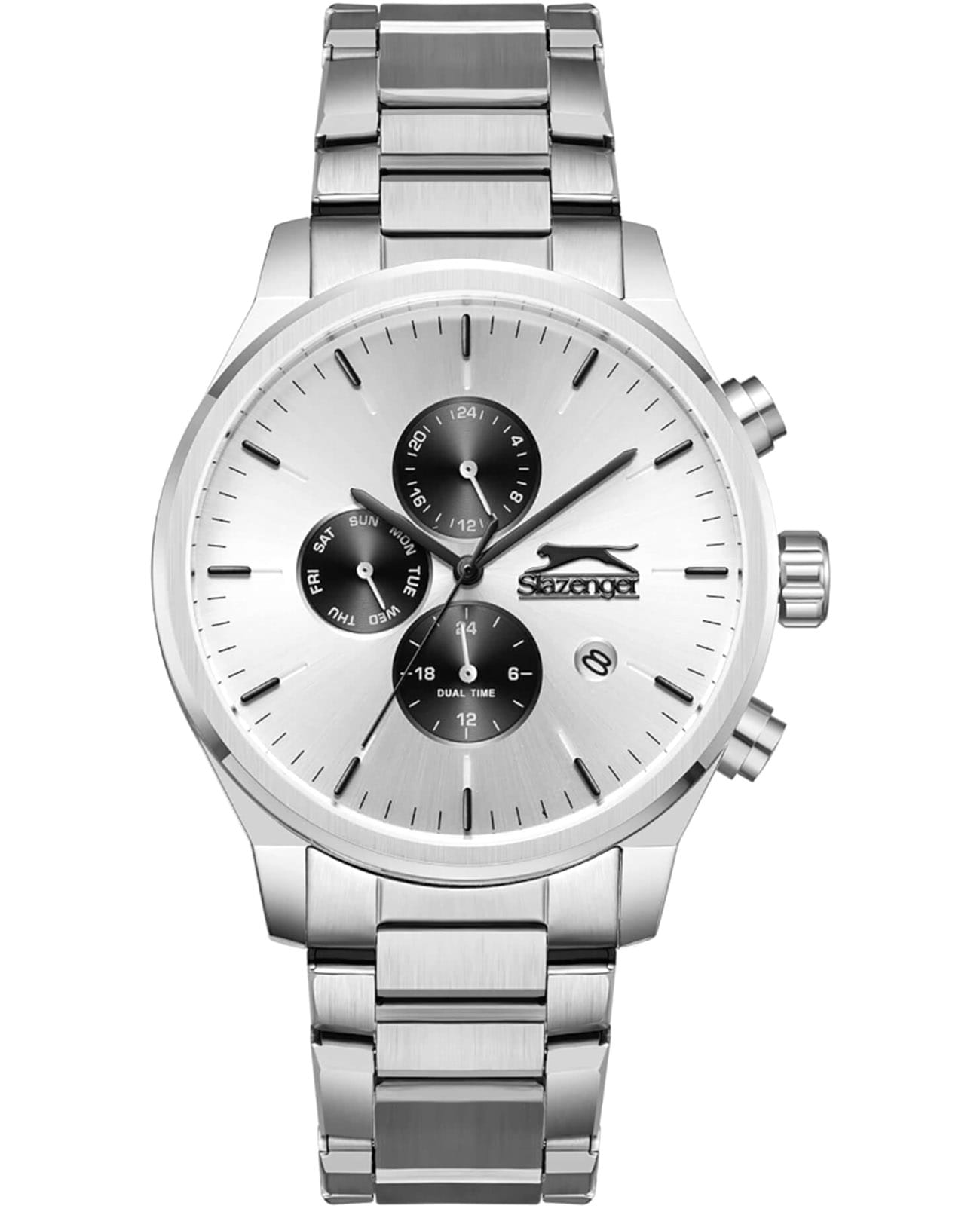 Мужские кварцевые часы Slazenger — это выразительный и функциональный аксессуар. Корпус диаметром 44 мм и толщиной 11 мм выполнен из нержавеющей стали 316L. Циферблат белого цвета оформлен индексами и стрелками. Циферблат защищён минеральным стекломМинеральное стеклоМинеральное стекло представляет собой искусственно выращенный минерал кварца. Такое стекло отличается особой устойчивостью к повреждениям и царапинам. Уступает по некоторым качествам сапфировому стеклу.. Механизм — кварцевый. Часы оснащены индикацией дня недели, даты, 12/24-часового формата времени и функцией второго часового пояса (GMT)Второй часовой поясФункция, позволяющая отображать время двух часовых поясов одновременно.. Окошко даты расположено между 4 и 5 часами. Часы оснащены стальным браслетом с раскладной застёжкойРаскладная застёжкаТакой тип застёжки используется только на браслетах из металла. Она никогда не раскрывается полностью, происходит разделение на 2 и более частей. Раскладывающая застёжка снизит вероятность потери часов к минимуму.. Водонепроницаемость 100 м позволяет использовать часы для плавания и повседневного ношения. Гарантия — 12 месяцев. Идеальный выбор для тех, кто ценит стиль, функциональность и качество.