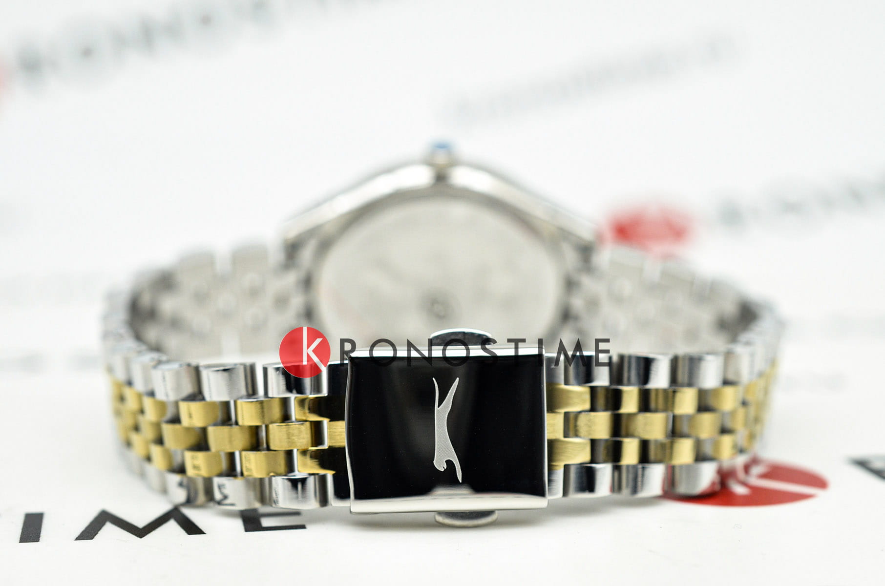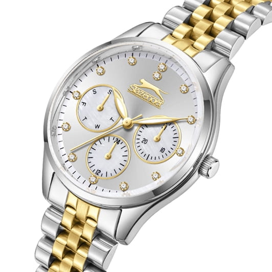 Женские кварцевые часы Slazenger — это элегантный и функциональный аксессуар. Корпус диаметром 34 мм и толщиной 11 мм выполнен из суперметалла. Циферблат серебристого цвета оформлен индексами и стрелками, украшен фианитами. Циферблат защищён минеральным стекломМинеральное стеклоМинеральное стекло представляет собой искусственно выращенный минерал кварца. Такое стекло отличается особой устойчивостью к повреждениям и царапинам. Уступает по некоторым качествам сапфировому стеклу.. Механизм — кварцевый. Часы оснащены индикацией дня недели, даты и 12/24-часового формата времени. Часы оснащены браслетом из суперметалла с IP-покрытиемIP-покрытиеМетод ионного напыления. Демонстрирует повышенную устойчивость к истиранию, окислению и химическим веществам. Под воздействием высокого давления и температуры около 1500°C молекулы металла надёжно соединяются с частицами корпуса часов. и раскладной застёжкойРаскладная застёжкаТакой тип застёжки используется только на браслетах из металла. Она никогда не раскрывается полностью, происходит разделение на 2 и более частей. Раскладывающая застёжка снизит вероятность потери часов к минимуму.. Водонепроницаемость 50 м позволяет использовать часы в повседневных условиях. Гарантия — 12 месяцев. Идеальный выбор для тех, кто ценит стиль, функциональность и качество.