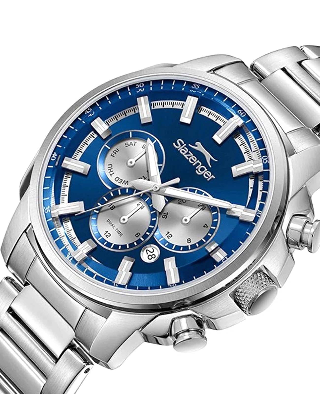 Мужские кварцевые часы Slazenger — это выразительный и функциональный аксессуар. Корпус диаметром 43 мм и толщиной 13,5 мм выполнен из нержавеющей стали 316L. Циферблат синего цвета оформлен индексами и стрелками. Циферблат защищён минеральным стекломМинеральное стеклоМинеральное стекло представляет собой искусственно выращенный минерал кварца. Такое стекло отличается особой устойчивостью к повреждениям и царапинам. Уступает по некоторым качествам сапфировому стеклу.. Механизм — кварцевый. Часы оснащены индикацией дня недели, даты, 12/24-часового формата времени и функцией второго часового пояса (GMT)Второй часовой поясФункция, позволяющая отображать время двух часовых поясов одновременно.. Окошко даты расположено между 4 и 5 часами. Часы оснащены стальным браслетом с раскладной застёжкойРаскладная застёжкаТакой тип застёжки используется только на браслетах из металла. Она никогда не раскрывается полностью, происходит разделение на 2 и более частей. Раскладывающая застёжка снизит вероятность потери часов к минимуму.. Водонепроницаемость 100 м позволяет использовать часы для плавания и повседневного ношения. Гарантия — 12 месяцев. Идеальный выбор для тех, кто ценит стиль, функциональность и качество.