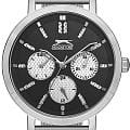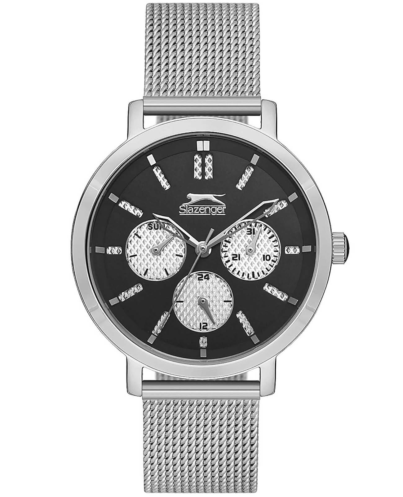 Женские кварцевые часы Slazenger — это выразительный и функциональный аксессуар. Корпус диаметром 36 мм и толщиной 9 мм выполнен из суперметалла. Циферблат чёрного цвета оформлен индексами, стрелками и тремя вынесенными субциферблатами: для отображения дня недели, даты и 24-часового формата времени. Циферблат защищён минеральным стекломМинеральное стеклоМинеральное стекло представляет собой искусственно выращенный минерал кварца. Такое стекло отличается особой устойчивостью к повреждениям и царапинам. Уступает по некоторым качествам сапфировому стеклу.. Часы оснащены браслетом миланского плетения из суперметалла на раскладном замкеРаскладная застёжкаТакой тип застёжки используется только на браслетах из металла. Она никогда не раскрывается полностью, происходит разделение на 2 и более частей. Раскладывающая застёжка снизит вероятность потери часов к минимуму.. Водонепроницаемость 30 м позволяет использовать часы в повседневных условиях. Идеальный выбор для тех, кто ценит стиль и качество.