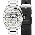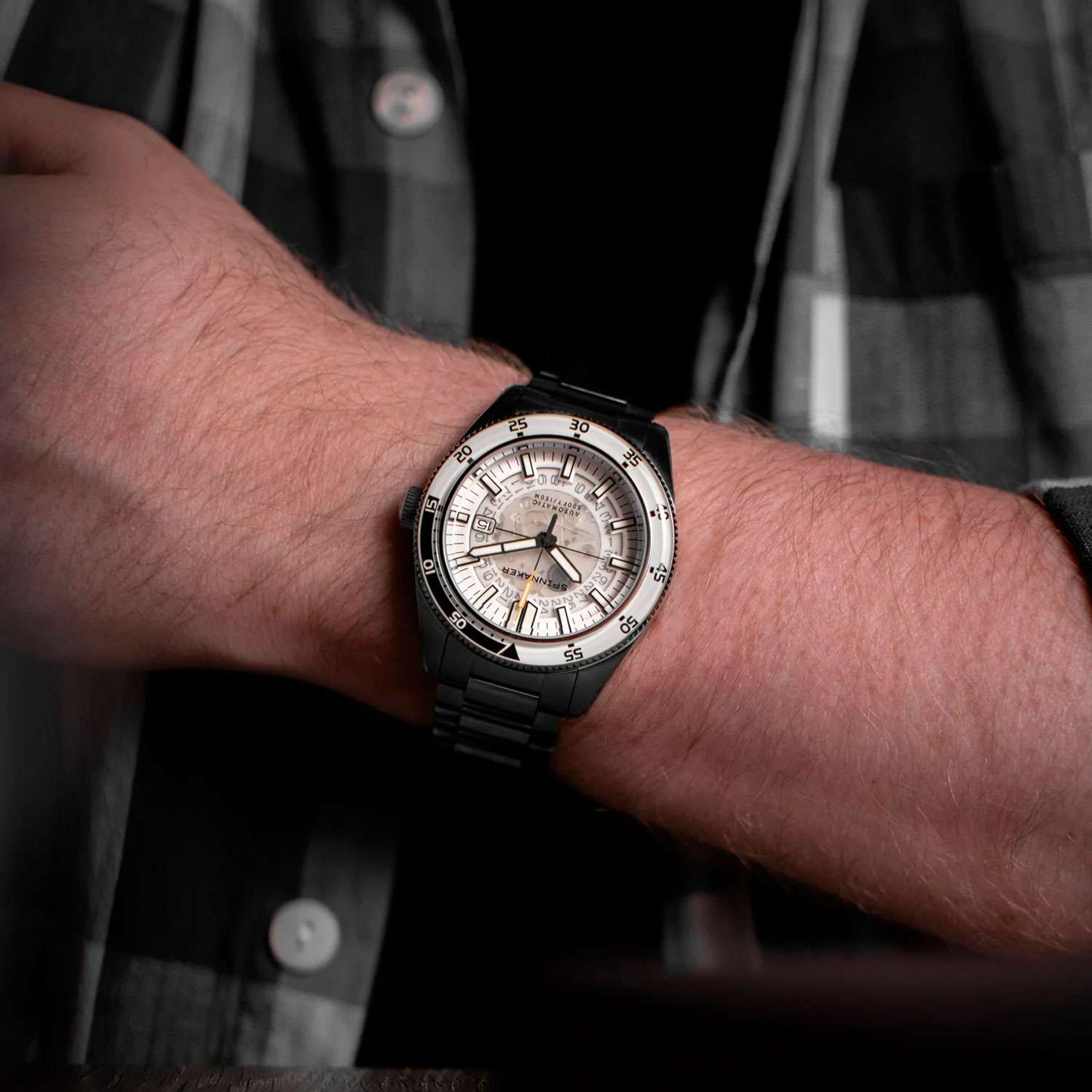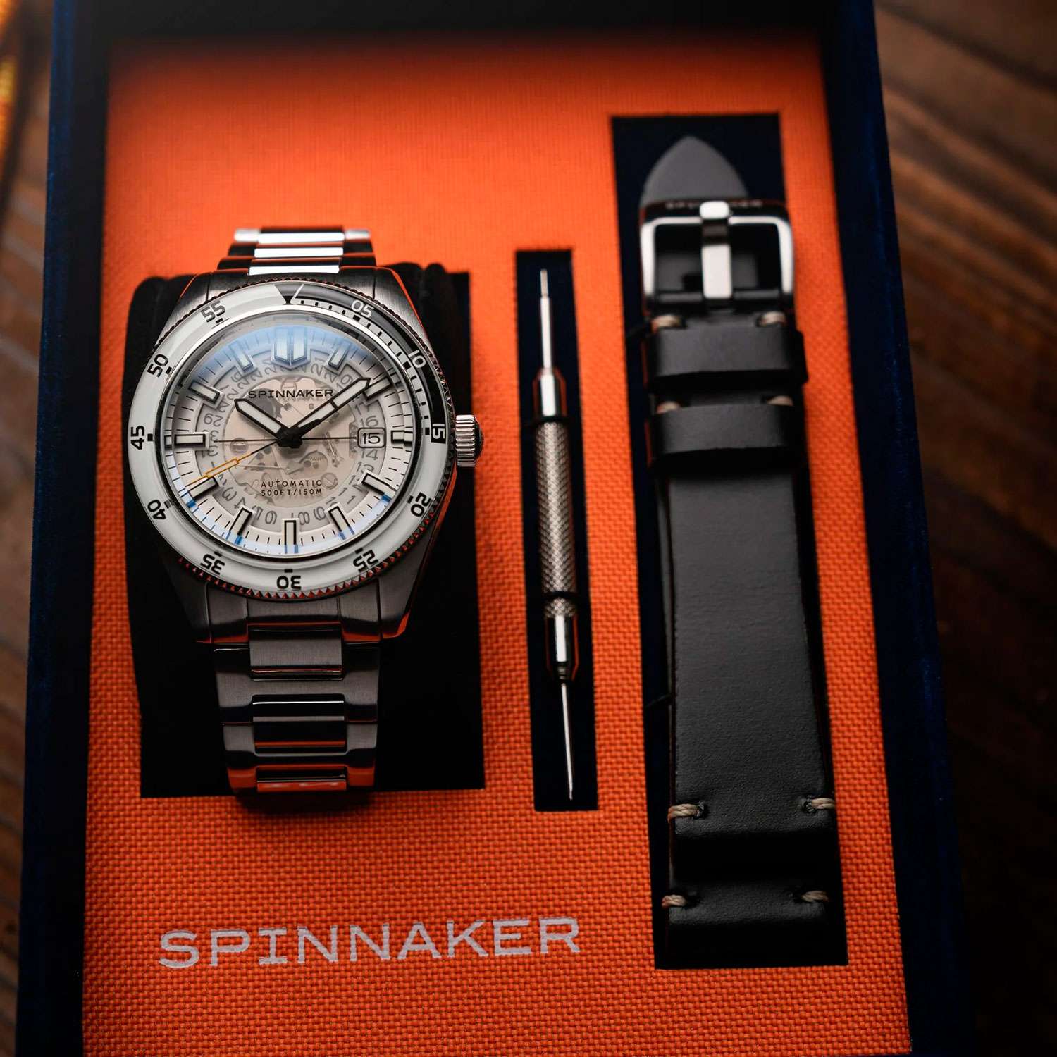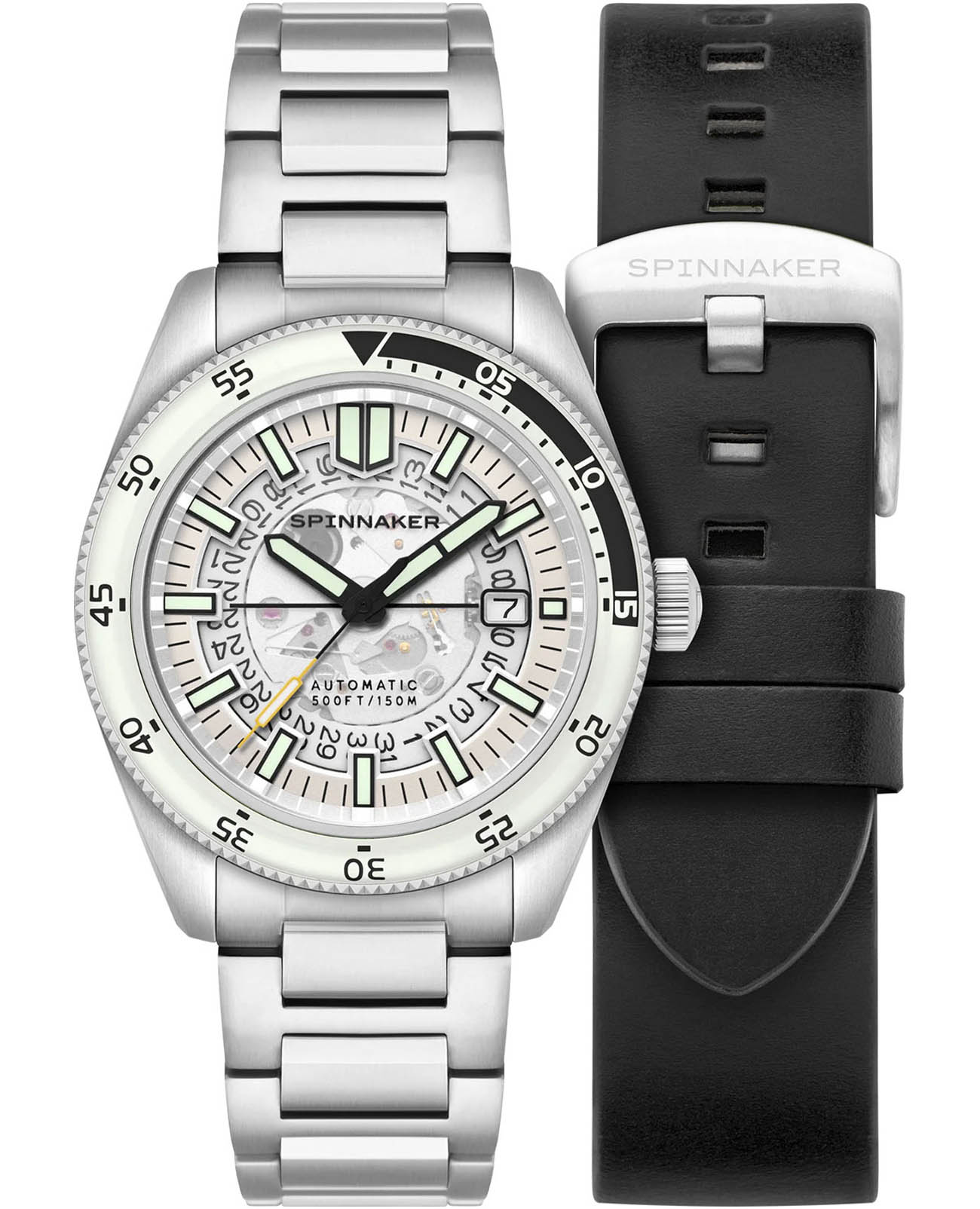 Мужские механические часы Spinnaker Fleuss SP-5118-33 с японским автоматическим механизмом, заключенные в круглый корпус диаметром 43 мм из высококачественной нержавеющей стали 316L. Модель привлекает внимание уникальным белым скелетонизированным циферблатом, сквозь который можно наблюдать работу точного механизма, дополненным люминесцентным покрытием Super-LumiNova®Люминесцентное покрытиеПозволяет считывать показания времени в темноте. Производители наносят на стрелки, часовые индексы, безель или поверхность циферблата светонакопительный состав, дающий холодное свечение. на стрелках и часовых метках для превосходной видимости в условиях недостаточной освещенности. Надежную защиту циферблата обеспечивает сапфировое стеклоСапфировое стеклоПрочный и надёжный материал из кристалла сапфира синтетического происхождения, характеризующийся особой твёрдостью и устойчивостью к царапинам и повреждениям. с антибликовым покрытием, отличающееся исключительной устойчивостью к царапинам, а впечатляющая водонепроницаемость до 150 метров (15 ATM) делает эти часы идеальным выбором для любителей плавания и снорклинга. Функциональный вращающийся безель с однонаправленным движением дополняет практичные характеристики модели, в то время как стальной браслет шириной 22 мм с раскладной застежкойРаскладная застёжкаТакой тип застёжки используется только на браслетах из металла. Она никогда не раскрывается полностью, происходит разделение на 2 и более частей. Раскладывающая застёжка снизит вероятность потери часов к минимуму. гарантирует надежную и комфортную посадку на запястье. В комплект также входит дополнительный кожаный ремешок, предоставляющий возможность разнообразить стиль ношения.