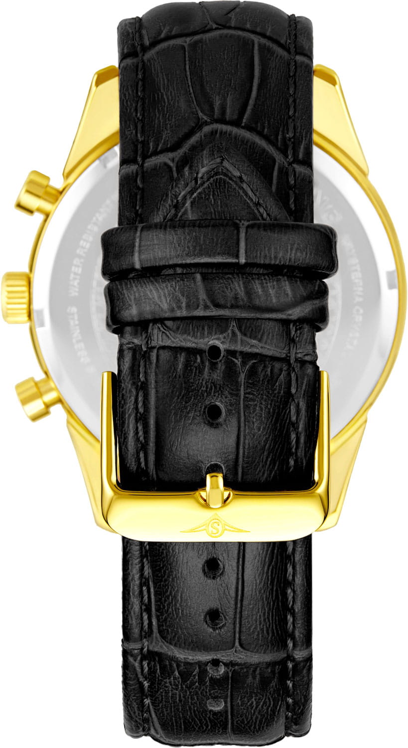 Stuhrling 3975L.4 — стильные мужские часы с выразительным пилотским дизайном и мощным функционалом. Классический циферблат дополнен контрастными счётчиками хронографаХронографФункция позволяет измерять отрезки времени с особой точностью: часы, минуты, секунды. Верным признаком хронографа является наличие на циферблате 3 дополнительных окошек-счётчиков., тахиметрической шкалой по ободу и аккуратным окошком даты, подчёркивающими технический характер модели. Корпус из нержавеющей стали с PVD-покрытиемPVDУльтратонкое покрытие наносится в технике вакуумного напыления, сочетает в себе нитрид титана особой прочности со слоем золота или оксида хрома. Несёт в себе декоративную или защитную функцию. придаёт часам надёжность и современный блеск, а стекло KrysternaKrysternaKrysterna — инновационное стекло для наручных часов. Благодаря уникальной структуре, Krysterna объединяет ключевые преимущества двух материалов: твердость сапфира, защищающую от царапин, и гибкость минерального стекла, обеспечивающую устойчивость к деформациям. Такая комбинация делает его идеальным решением для часов, подверженных экстремальным нагрузкам, сохраняя при этом оптическую прозрачность. защищает поверхность от царапин и сохраняет кристальную прозрачность. Кожаный ремень с классической текстурой аллигатора и стандартной застежкой, обеспечивает комфорт и элегантную посадку на запястье. Stuhrling — гармония силы, точности и изысканного стиля для мужчин, ценящих уверенность и безупречный вкус.