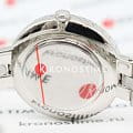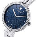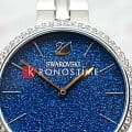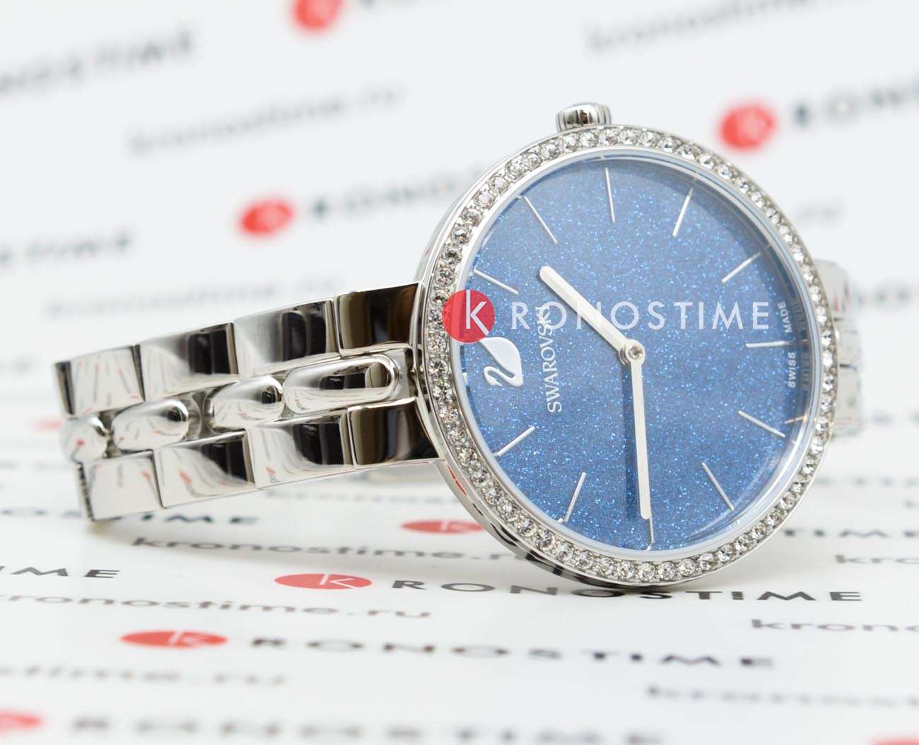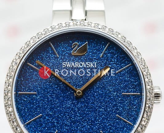 Синий циферблат с изящными серебристыми метками и стрелками подчёркивает элегантность часов. На отметке «12 часов» расположен логотип Swarovski в виде лебедя.