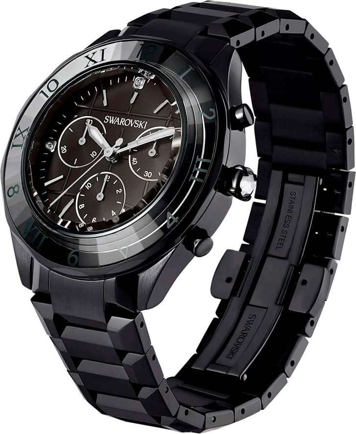 Часы Swarovski 5641393 представляют собой гармоничное сочетание современного стиля и функциональности, идеально подходящее для тех, кто ценит элегантные аксессуары. Эти швейцарские кварцевые часы с хронографомХронографФункция позволяет измерять отрезки времени с особой точностью: часы, минуты, секунды. Верным признаком хронографа является наличие на циферблате 3 дополнительных окошек-счётчиков. и секундомеромСекундомерСекундоме́р — прибор, способный измерять интервалы времени с точностью до долей секунды. заключены в прочный стальной корпус с черным PVDPVDУльтратонкое покрытие наносится в технике вакуумного напыления, сочетает в себе нитрид титана особой прочности со слоем золота или оксида хрома. Несёт в себе декоративную или защитную функцию. покрытием. Черный циферблат, украшенный кристаллами Swarovski и метками в виде штрихов, придает часам изысканный вид и подчеркивает их утонченность. Ограненный кристальный безельБезельВнешний ободок, закрепляющий стекло. В спортивных часах так называется поворотное кольцо с делениями на циферблате, выполняет роль таймера – замеряет отрезки времени на шкале. Неподвижный безель – элемент декора. Однонаправленно вращающийся безель на дайверских часах позволяет фиксировать моменты погружения и выныривания на поверхность. черного с римскими и арабскими цифрами добавляет оригинальности и делает часы не только стильными, но и удобными для считывания времени. Минеральное стеклоМинеральное стеклоМинеральное стекло представляет собой искусственно выращенный минерал кварца. Такое стекло отличается особой устойчивостью к повреждениям и царапинам. Уступает по некоторым качествам сапфировому стеклу. обеспечивает надежную защиту циферблата, а водозащита 50 WR позволяет не беспокоиться о случайных контактах с водой в повседневной жизни. Стальной браслет с черным PVDPVDУльтратонкое покрытие наносится в технике вакуумного напыления, сочетает в себе нитрид титана особой прочности со слоем золота или оксида хрома. Несёт в себе декоративную или защитную функцию. покрытием и застежкой «бабочка»Застёжка "бабочка"Такой вид застёжки дополняется предохранителями, помогающими избежать случайного раскрытия браслета. Обладают изящным исполнением. обеспечивает комфортное ношение и надежную фиксацию на запястье. Заводная головка, украшенная кристаллом круглой огранки, придает дополнительную изящность и завершенность общему виду. С диаметром корпуса 39 мм и длиной браслета 16 см, эти часы станут идеальным аксессуаром для тех, кто ценит качество, стиль и функциональность в одном изделии.