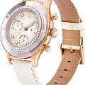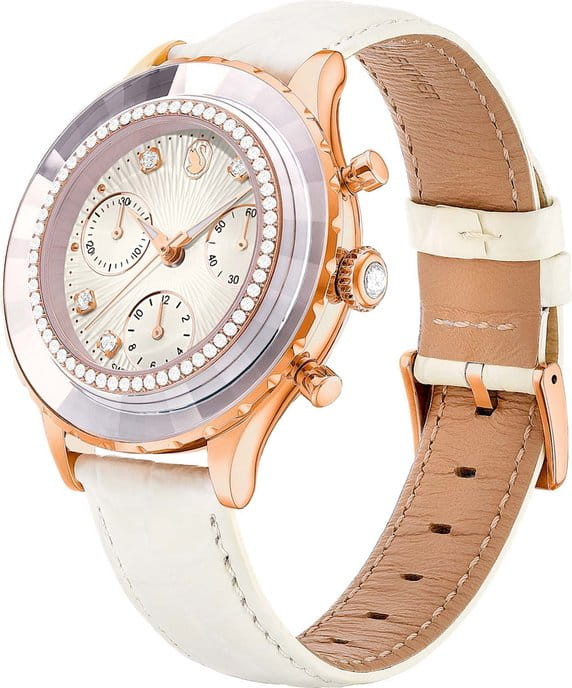 Часы Swarovski 5671150 представляют собой изысканное сочетание стиля и функциональности, идеально подходящее для ценителей элегантных аксессуаров. Эти швейцарские кварцевые часы с хронографомХронографФункция позволяет измерять отрезки времени с особой точностью: часы, минуты, секунды. Верным признаком хронографа является наличие на циферблате 3 дополнительных окошек-счётчиков. и секундомеромСекундомерСекундоме́р — прибор, способный измерять интервалы времени с точностью до долей секунды. заключены в корпус из стали с розовым PVDPVDУльтратонкое покрытие наносится в технике вакуумного напыления, сочетает в себе нитрид титана особой прочности со слоем золота или оксида хрома. Несёт в себе декоративную или защитную функцию. покрытием, который дополнен белым циферблатом. Особое внимание привлекает инкрустация кристаллами Swarovski, украшающими корпус и циферблат, создавая эффектный блеск и подчеркивая роскошь изделия. Минеральное стеклоМинеральное стеклоМинеральное стекло представляет собой искусственно выращенный минерал кварца. Такое стекло отличается особой устойчивостью к повреждениям и царапинам. Уступает по некоторым качествам сапфировому стеклу. надежно защищает циферблат, а водозащита 50 WR позволяет не беспокоиться о контакте с водой в повседневных ситуациях. Эти часы не только точные и надежные, благодаря кварцевому механизму, но и невероятно стильные, благодаря кристальному безелюБезельВнешний ободок, закрепляющий стекло. В спортивных часах так называется поворотное кольцо с делениями на циферблате, выполняет роль таймера – замеряет отрезки времени на шкале. Неподвижный безель – элемент декора. Однонаправленно вращающийся безель на дайверских часах позволяет фиксировать моменты погружения и выныривания на поверхность. и белому ремешку из натуральной итальянской телячьей кожи с тиснением под крокодила, что обеспечивает комфортное ношение и стильный внешний вид. Заводная головка дополнительно украшена кристаллом круглой огранки, придающим часам завершенность и изящество. Люминесцентное покрытиеЛюминесцентное покрытиеПозволяет считывать показания времени в темноте. Производители наносят на стрелки, часовые индексы, безель или поверхность циферблата светонакопительный состав, дающий холодное свечение. на стрелках обеспечивает отличную видимость в темноте. Эти часы не просто аксессуар, а настоящее произведение искусства, способное стать ярким акцентом любого образа.