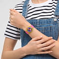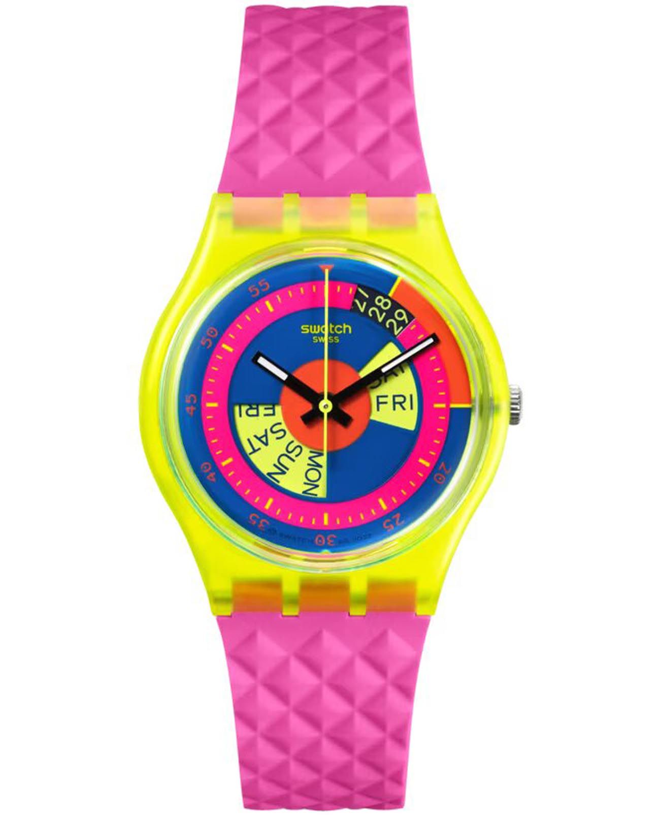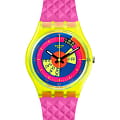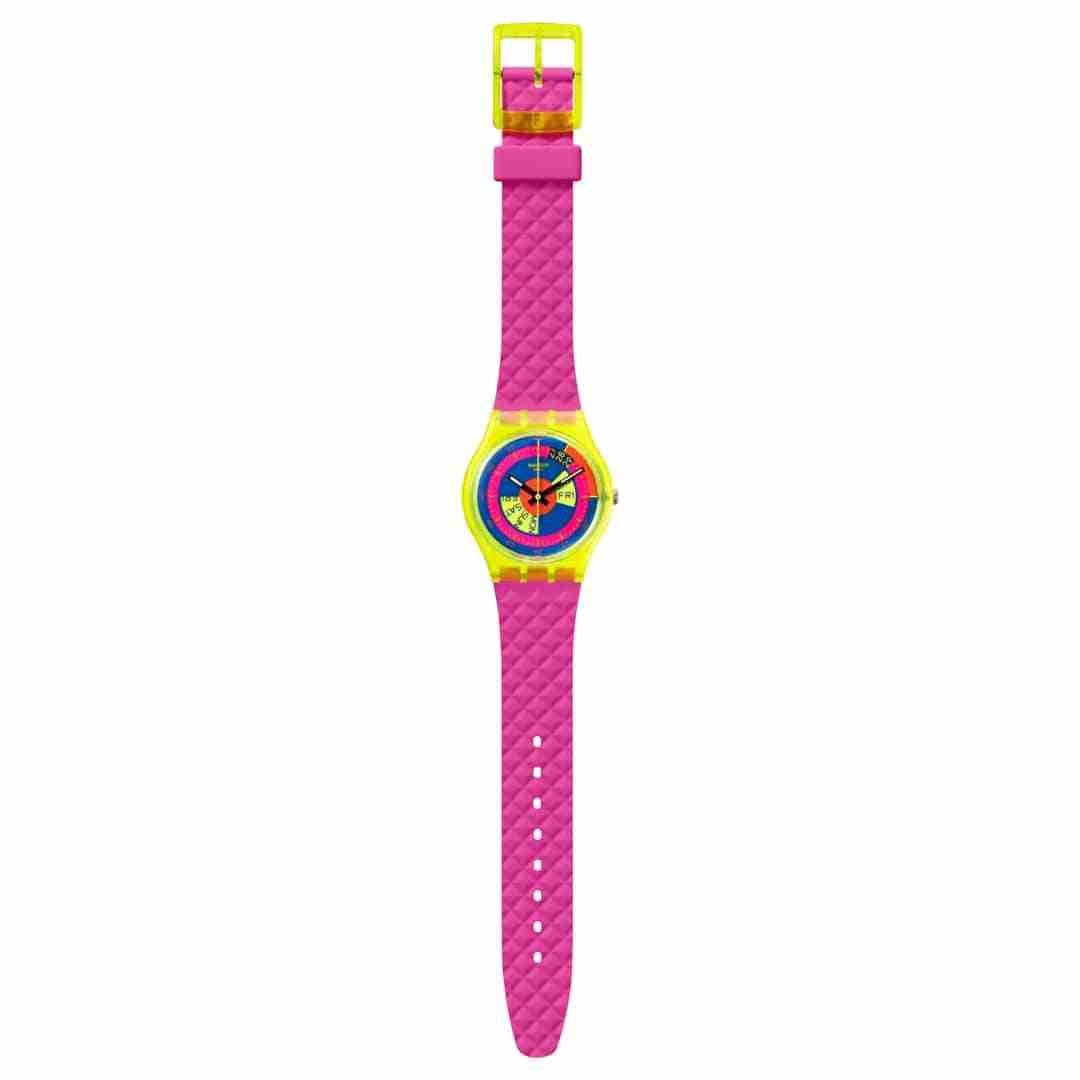 Эти ярко окрашенные ретро-часы Swatch SO28J700 вдохновлены часами Swatch из 90-х: SKYCHART GN705. Их многоцветный неоновый циферблат помещен в прозрачный корпус желтого цвета, изготовленный из биоматериалов. Ремешок ярко-розового цвета и прозрачная желтая пряжка завершают неоновый образ этих винтажных часов Swatch.