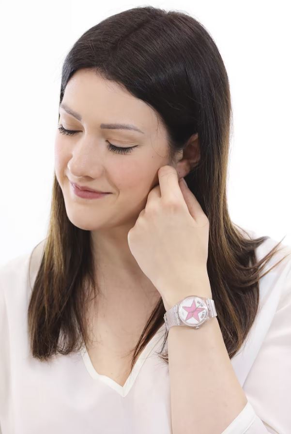 Часы Swatch SSO28Z108 — это специальное издание ко Дню Матери. Часы с эффектным циферблатом, украшенным яркой розовой звездой и золотыми деталями: аппликациями, стрелками и надписью "YOU'RE A STAR". Прозрачный блестящий корпус из биоматериала установлен на прозрачном силиконовом ремешке, украшенном металлическими блестящими петлями и дополнительными съемными петлями в форме сердца. Внутри часов установлен надежный кварцевый механизм, который обеспечивает точность хода. Эти часы водонепроницаемы до 30 метров, что позволяет не беспокоиться о случайных брызгах или дождевых каплях. Swatch SO28Z108 — это идеальный выбор для тех, кто ценит сочетание стиля, комфорта и функциональности в одном аксессуаре.
