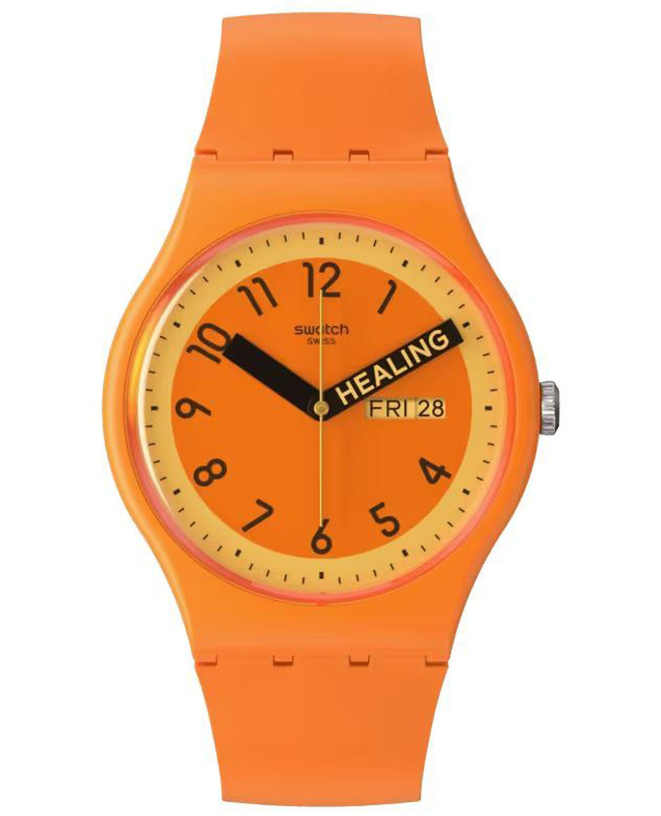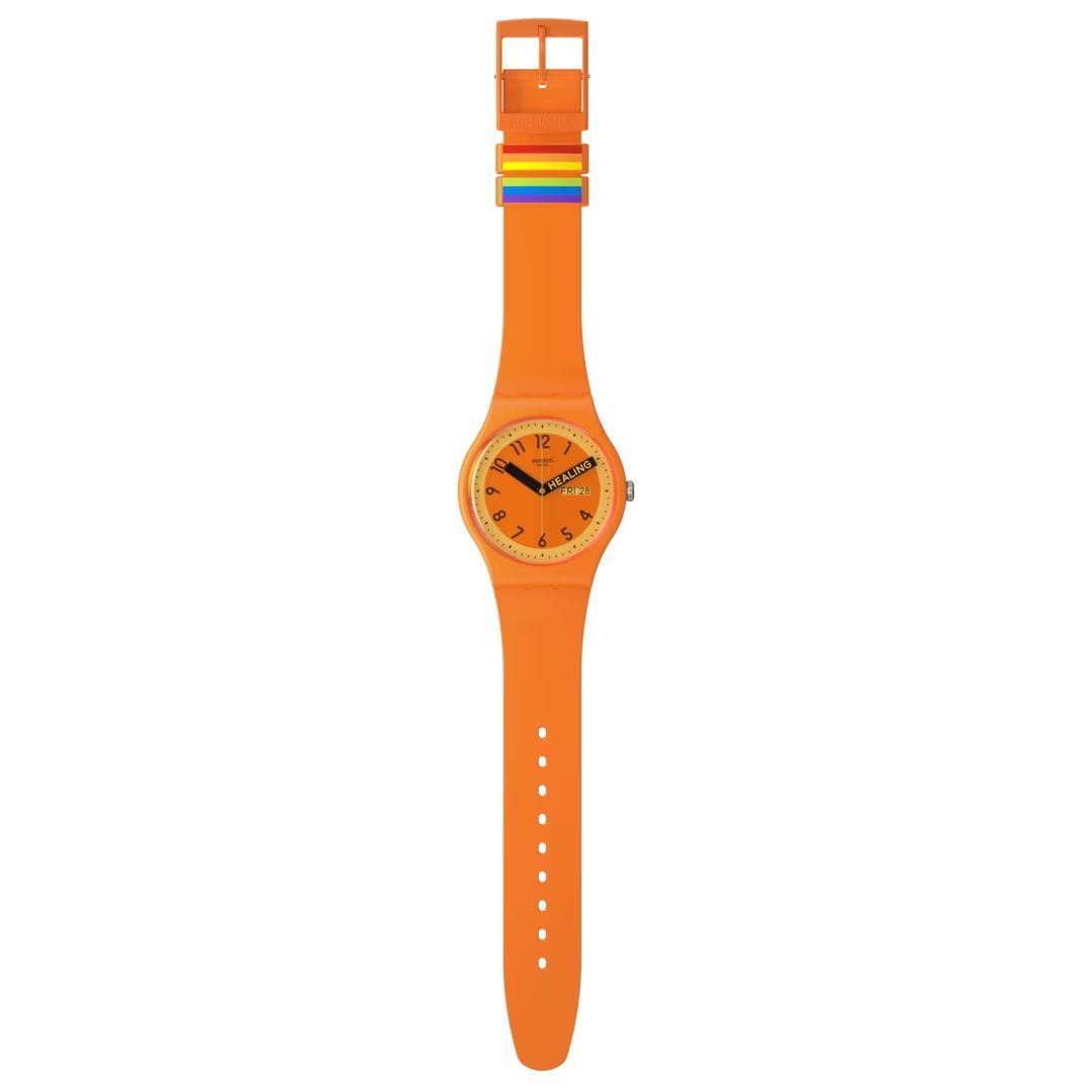Часы Swatch SO29O700 — стильный и надежный аксессуар. Эти специальные часы Swatch Pride 2023 имеют циферблат с оранжевым принтом и оранжевое стекло из биоматериала в корпусе из биоматериала. Стрелки часов и минут - черные, надпись на стрелке HEALING символизирует значение цвета — исцеление. Соответствующий ремешок этих оранжевых часов включает две специальные петли, которые образуют радугу, когда они соединены. Ремешок силиконовый на классической застежке. Имеется окошко даты и дня недели в положении 3 часа. Внутри часов установлен надежный кварцевый механизм, который обеспечивает точность хода. Эти часы водонепроницаемы до 30 метров, что позволяет не беспокоиться о случайных брызгах или дождевых каплях. Swatch SO29O700 — это идеальный выбор для тех, кто ценит сочетание стиля, комфорта и функциональности в одном аксессуаре.