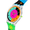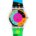 Часы Swatch SS08K119 — это стильный и современный аксессуар для тех, кто ценит лёгкость и комфорт. Часы идеально подойдут как для мужчин, так и для женщин. Эти ультратонкие часы выполнены по мотивам коллекционной модели Swatch 80-х годов: HOT RACER (LK115). Яркий разноцветный циферблат с зелеными часовой и минутной стрелками заключен в блестящий прозрачный корпус из биоматериала и покрыт биостеклом. Нижняя часть просвечивающего ремешка имеет матовую зеленую расцветку, а верхняя – голубая. Ремешок украшен красочным принтом и дополнен оранжевым тренчиком и зеленой пряжкой. Водозащита 30 метров делает часы практичными для повседневного использования. Эти часы подойдут для повседневного ношения и станут ярким акцентом в вашем наряде.
