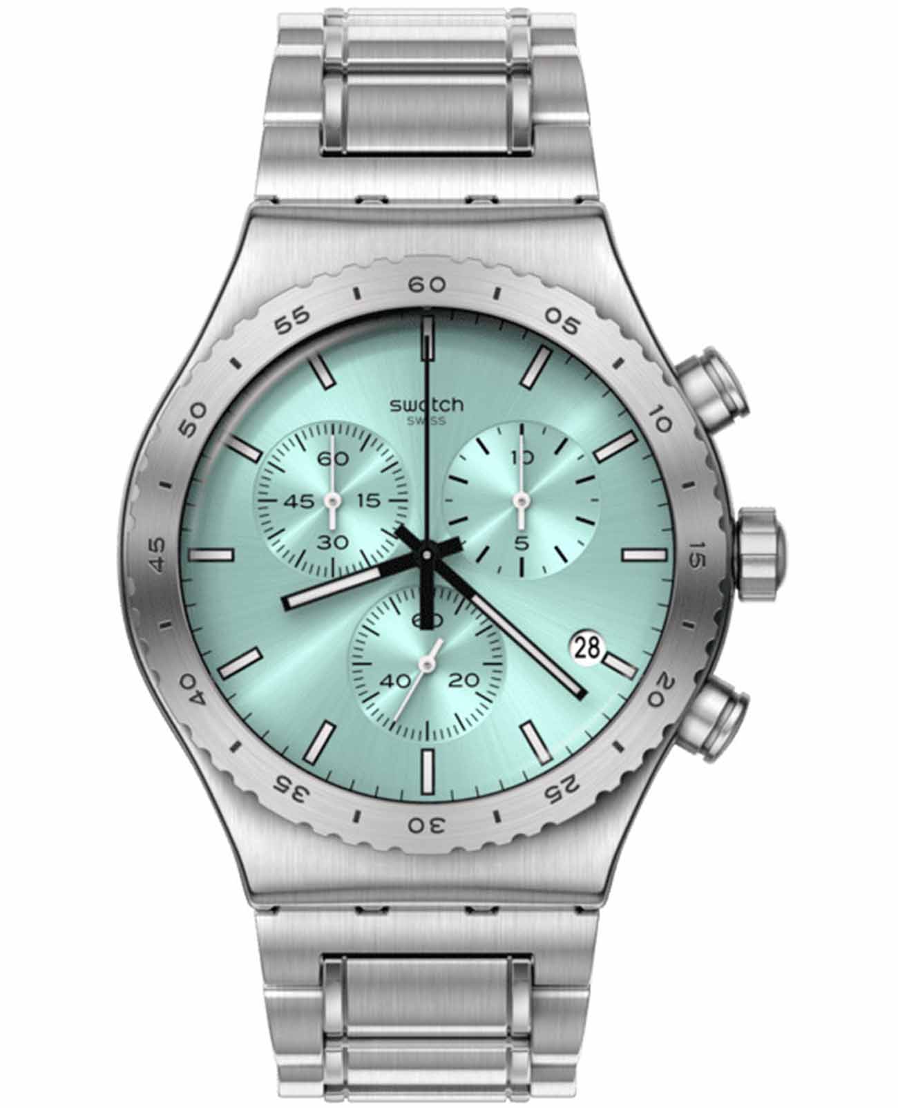 Часы Swatch YVS498G — это стильный и современный аксессуар для тех, кто ценит лёгкость и комфорт. Эта стильная модель часов из нержавеющей стали дополнена матовым металлическим браслетом из нержавеющей стали со съемными звеньями и застёжкой «бабочка»Застёжка "бабочка"Такой вид застёжки дополняется предохранителями, помогающими избежать случайного раскрытия браслета. Обладают изящным исполнением. . Бирюзовый циферблат с радиальной полировкой оснащен хронографомХронографФункция позволяет измерять отрезки времени с особой точностью: часы, минуты, секунды. Верным признаком хронографа является наличие на циферблате 3 дополнительных окошек-счётчиков. и светящимися в темноте индексами и стрелками из-за люминесцентного покрытияЛюминесцентное покрытиеПозволяет считывать показания времени в темноте. Производители наносят на стрелки, часовые индексы, безель или поверхность циферблата светонакопительный состав, дающий холодное свечение. заключен в матовый корпус из нержавеющей стали. Завершают образ индикатор даты в положении «4 часа» на циферблате, а также темно-серые цифры и индексы на безелеБезельВнешний ободок, закрепляющий стекло. В спортивных часах так называется поворотное кольцо с делениями на циферблате, выполняет роль таймера – замеряет отрезки времени на шкале. Неподвижный безель – элемент декора. Однонаправленно вращающийся безель на дайверских часах позволяет фиксировать моменты погружения и выныривания на поверхность. из нержавеющей стали. Водозащита 30 метров делает часы практичными для повседневного использования. Эти часы подойдут для повседневного ношения и станут ярким акцентом в вашем наряде.
