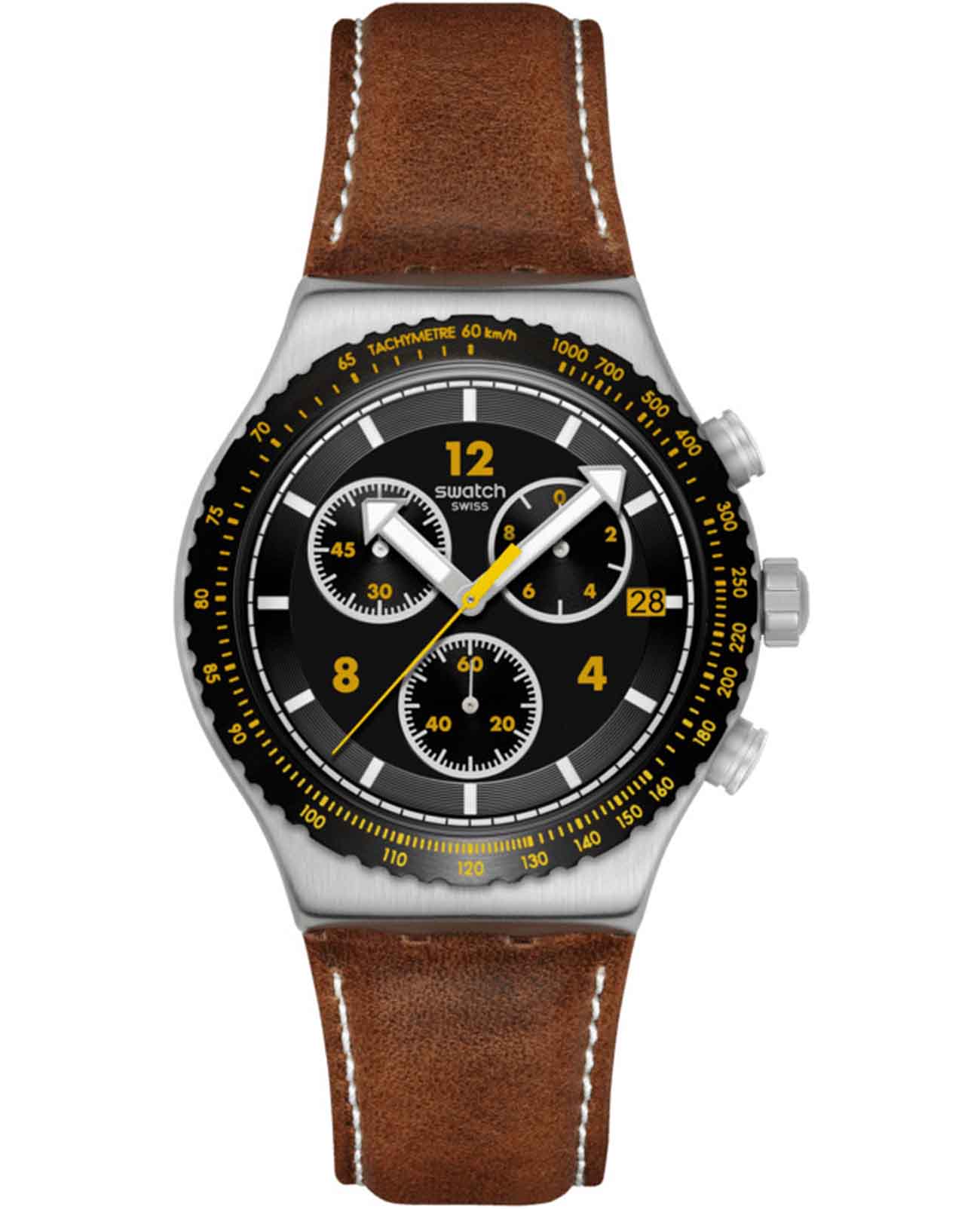Часы Swatch YVS530 — это стильный и современный аксессуар для тех, кто ценит лёгкость и комфорт. Этот стальной хронографХронографФункция позволяет измерять отрезки времени с особой точностью: часы, минуты, секунды. Верным признаком хронографа является наличие на циферблате 3 дополнительных окошек-счётчиков. оснащен черным циферблатом с радиальной полировкой, желтыми цифрами, светящимися в темноте часовыми индексами из-за люминесцентного покрытияЛюминесцентное покрытиеПозволяет считывать показания времени в темноте. Производители наносят на стрелки, часовые индексы, безель или поверхность циферблата светонакопительный состав, дающий холодное свечение., а также желтым окошком календаря с черным принтом в районе отметки 3 часа. Отсчет времени ведут остроконечные часовая и минутная стрелки серебристой расцветки, светящиеся в темноте из-за люминесцентного покрытияЛюминесцентное покрытиеПозволяет считывать показания времени в темноте. Производители наносят на стрелки, часовые индексы, безель или поверхность циферблата светонакопительный состав, дающий холодное свечение., а также желтая секундная стрелка хронографаХронографФункция позволяет измерять отрезки времени с особой точностью: часы, минуты, секунды. Верным признаком хронографа является наличие на циферблате 3 дополнительных окошек-счётчиков.. Часы заключены в матовый стальной корпус, на безельБезельВнешний ободок, закрепляющий стекло. В спортивных часах так называется поворотное кольцо с делениями на циферблате, выполняет роль таймера – замеряет отрезки времени на шкале. Неподвижный безель – элемент декора. Однонаправленно вращающийся безель на дайверских часах позволяет фиксировать моменты погружения и выныривания на поверхность. с черным PVDPVDУльтратонкое покрытие наносится в технике вакуумного напыления, сочетает в себе нитрид титана особой прочности со слоем золота или оксида хрома. Несёт в себе декоративную или защитную функцию. покрытием нанесена желтая шкала тахиметраТахиметрРазмеченная шкала, располагается на ободке или безеле часов. Тахиметр позволяет рассчитать скорость на определённом участке пути, расстояние измеряется в километрах или милях.. Модель дополнена кожаным коричневым ремешком с контрастной строчкой, тренчиками в тон и матированной полупряжкой из стали. Водозащита 30 метров делает часы практичными для повседневного использования. Эти часы подойдут для повседневного ношения и станут ярким акцентом в вашем наряде.