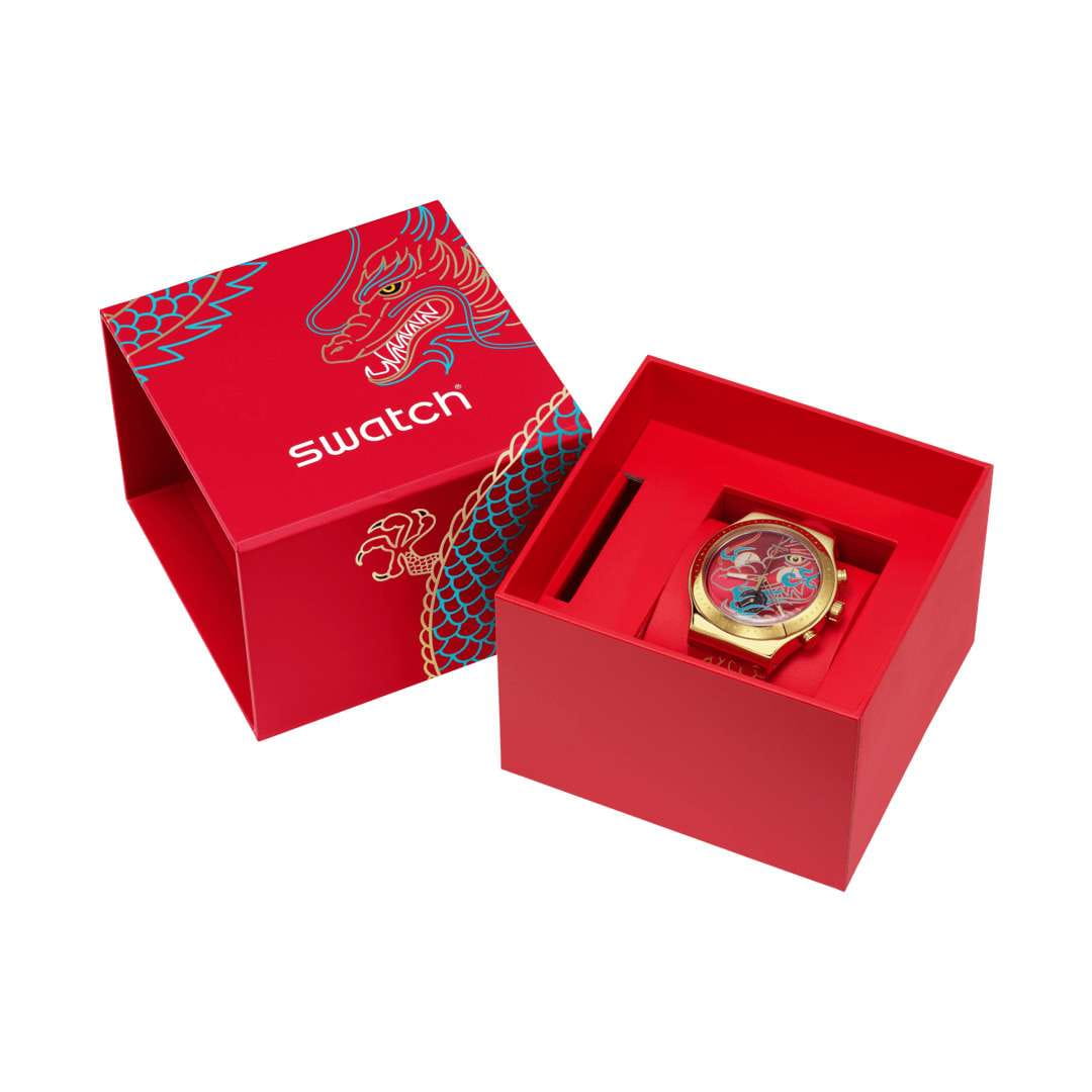 Часы Swatch YVZ100 — это стильный и современный аксессуар для тех, кто ценит лёгкость и комфорт. Этот красный хронографХронографФункция позволяет измерять отрезки времени с особой точностью: часы, минуты, секунды. Верным признаком хронографа является наличие на циферблате 3 дополнительных окошек-счётчиков. с блестящим золотым корпусом и безелемБезельВнешний ободок, закрепляющий стекло. В спортивных часах так называется поворотное кольцо с делениями на циферблате, выполняет роль таймера – замеряет отрезки времени на шкале. Неподвижный безель – элемент декора. Однонаправленно вращающийся безель на дайверских часах позволяет фиксировать моменты погружения и выныривания на поверхность. с PVDPVDУльтратонкое покрытие наносится в технике вакуумного напыления, сочетает в себе нитрид титана особой прочности со слоем золота или оксида хрома. Несёт в себе декоративную или защитную функцию. покрытием и такой же пряжкой на ремешке украшен изображением дракона. Цветной принт размещен как на циферблате с радиальной шлифовкой, так и на ремешке. На черные тренчики нанесены красная и золотистая надписи. На часовую и минутную стрелки нанесено люминесцентное покрытиеЛюминесцентное покрытиеПозволяет считывать показания времени в темноте. Производители наносят на стрелки, часовые индексы, безель или поверхность циферблата светонакопительный состав, дающий холодное свечение., которое светится в темноте, создавая необычное изображение. Водозащита 30 метров делает часы практичными для повседневного использования. Эти часы подойдут для повседневного ношения и станут ярким акцентом в вашем наряде.