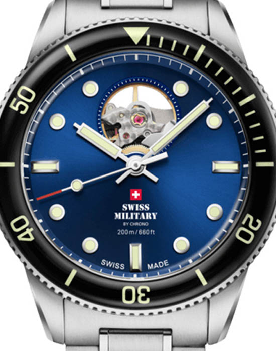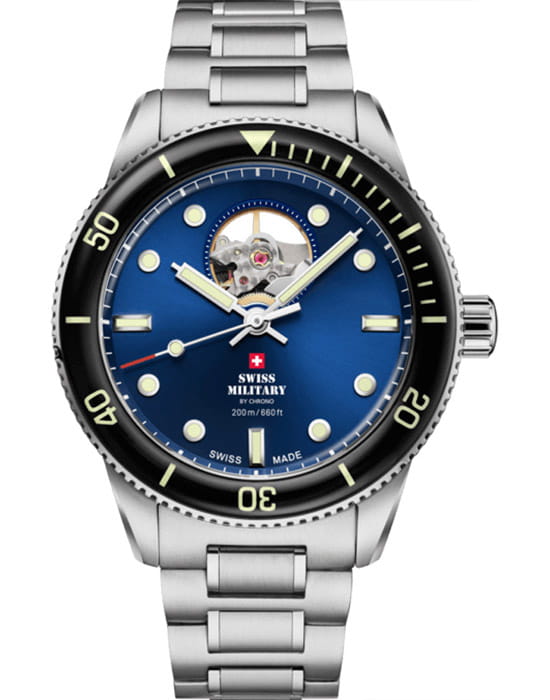Модель SMA34106.12 от Swiss Military by Chrono сочетает профессиональные характеристики дайверских часов с классическим швейцарским качеством. Корпус и браслет выполнены из нержавеющей стали. Циферблат с метками, покрытыми люминесцентным покрытиемЛюминесцентное покрытиеПозволяет считывать показания времени в темноте. Производители наносят на стрелки, часовые индексы, безель или поверхность циферблата светонакопительный состав, дающий холодное свечение., обеспечивает отличную читаемость в темноте. Механизм с автоматическим подзаводом обеспечивает стабильную работу с запасом хода до 38 часов. Циферблат защищён сапфировым стекломСапфировое стеклоПрочный и надёжный материал из кристалла сапфира синтетического происхождения, характеризующийся особой твёрдостью и устойчивостью к царапинам и повреждениям. с антибликовым покрытиемАнтибликовое покрытиеСлой оксида металла в 0,13-0,3 микрон, благодаря которому стекло часов не бликует и не отражает свет. Антибликовое покрытие уменьшает отражение света в 10 раз, обеспечивая отличную читаемость показателей циферблата.. Установлена раскладная застёжкаРаскладная застёжкаТакой тип застёжки используется только на браслетах из металла. Она никогда не раскрывается полностью, происходит разделение на 2 и более частей. Раскладывающая застёжка снизит вероятность потери часов к минимуму. для надёжной фиксации. Односторонний вращающийся безель с PVD-покрытиемPVDУльтратонкое покрытие наносится в технике вакуумного напыления, сочетает в себе нитрид титана особой прочности со слоем золота или оксида хрома. Несёт в себе декоративную или защитную функцию. позволяет точно отслеживать время погружения. Водонепроницаемость до 200 метров делает модель подходящей для дайвинга.
