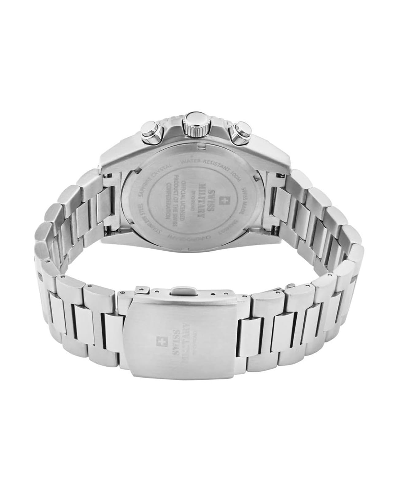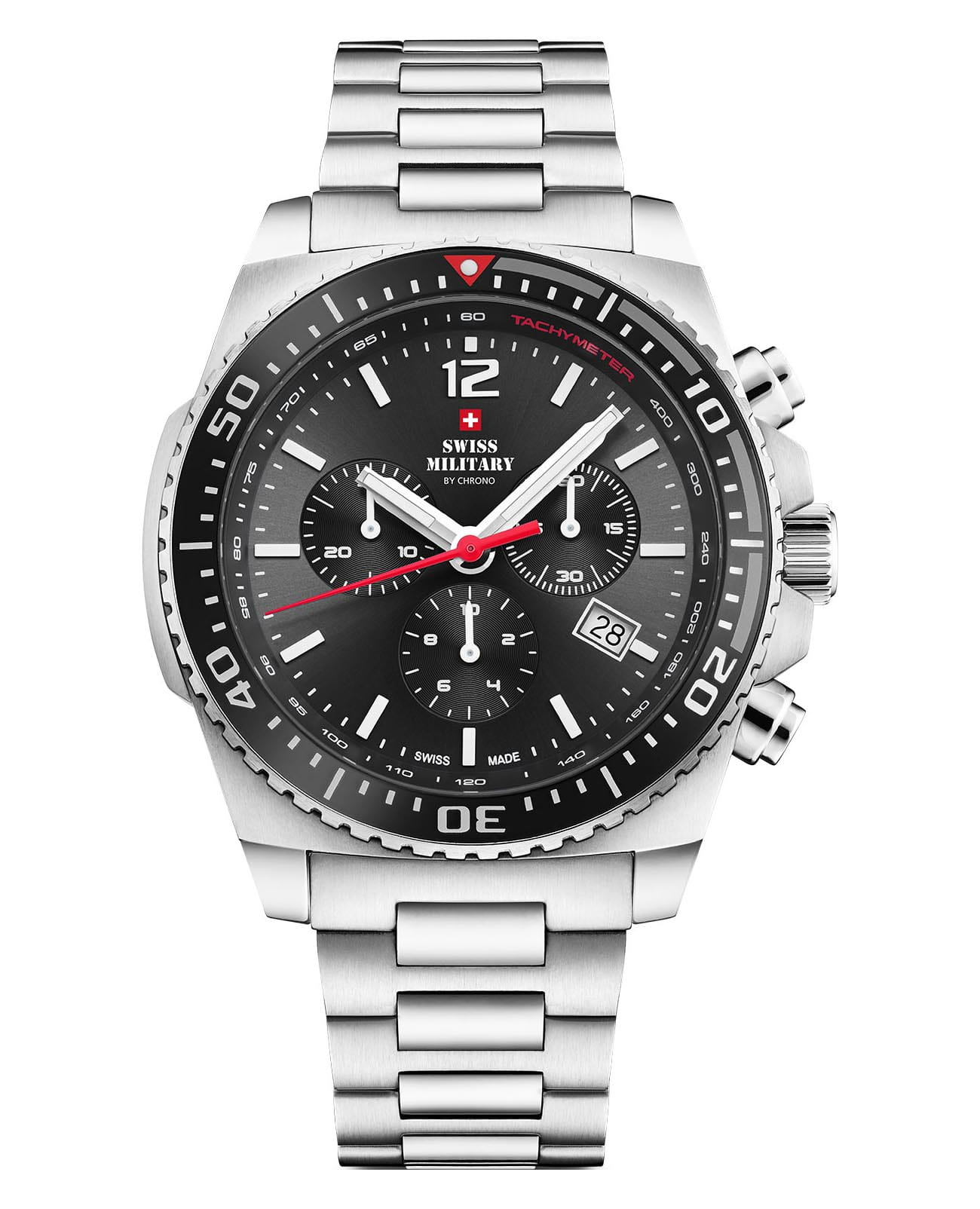 Мужские швейцарские часы-хронографХронографФункция позволяет измерять отрезки времени с особой точностью: часы, минуты, секунды. Верным признаком хронографа является наличие на циферблате 3 дополнительных окошек-счётчиков. с секундомеромСекундомерСекундоме́р — прибор, способный измерять интервалы времени с точностью до долей секунды. и с тахиметромТахиметрРазмеченная шкала, располагается на ободке или безеле часов. Тахиметр позволяет рассчитать скорость на определённом участке пути, расстояние измеряется в километрах или милях. Swiss Military by Chrono Sports SM34093.01, кварцевый механизм с высокой точностью. Минеральное стеклоМинеральное стеклоМинеральное стекло представляет собой искусственно выращенный минерал кварца. Такое стекло отличается особой устойчивостью к повреждениям и царапинам. Уступает по некоторым качествам сапфировому стеклу. устойчивое к мелким механическим повреждениям. Корпус часов изготовлен из нержавеющей стали. Вращающийся безельБезельВнешний ободок, закрепляющий стекло. В спортивных часах так называется поворотное кольцо с делениями на циферблате, выполняет роль таймера – замеряет отрезки времени на шкале. Неподвижный безель – элемент декора. Однонаправленно вращающийся безель на дайверских часах позволяет фиксировать моменты погружения и выныривания на поверхность. из стали с PVD-покрытиемPVDУльтратонкое покрытие наносится в технике вакуумного напыления, сочетает в себе нитрид титана особой прочности со слоем золота или оксида хрома. Несёт в себе декоративную или защитную функцию.. На циферблате расположены три дополнительных индикатора и окошко даты. Окошко даты находится в положении 4 часа. Стрелки с люминесцентным покрытиемЛюминесцентное покрытиеПозволяет считывать показания времени в темноте. Производители наносят на стрелки, часовые индексы, безель или поверхность циферблата светонакопительный состав, дающий холодное свечение.. Класс водозащиты: 100 метров, позволит плавать, нырять и заниматься другими водными видами спорта. Стальной браслет на раскладной застёжкеРаскладная застёжкаТакой тип застёжки используется только на браслетах из металла. Она никогда не раскрывается полностью, происходит разделение на 2 и более частей. Раскладывающая застёжка снизит вероятность потери часов к минимуму..