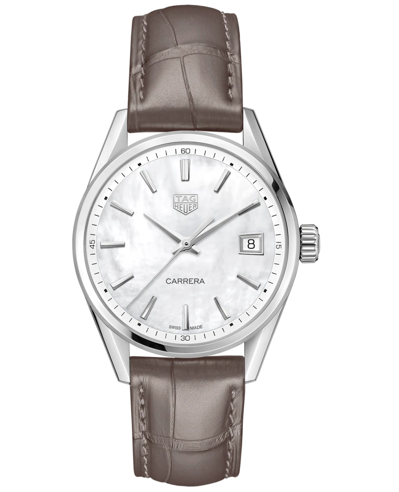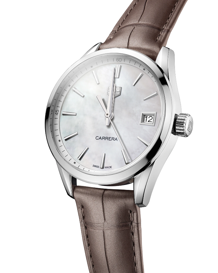 Эффектные кварцевые часы TAG Heuer Carrera Lady с актуально элегантным сочетанием циферблата из натурального белого перламутра и простроченного коричневого ремешка из кожи аллигатора. TAG Heuer Carrera Lady WBK1311.FC8258, кварцевый механизм с высокой точностью. Сапфировое стекло устойчивое к появлению царапин, обладающее высокой прозрачностью. Класс водозащиты: 100 метров, позволит плавать, нырять и заниматься другими водными видами спорта. Корпус часов изготовлен из стали, серебристого цвета.